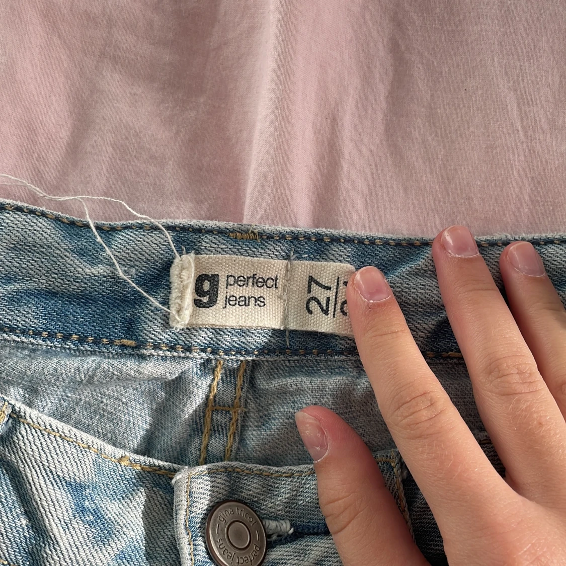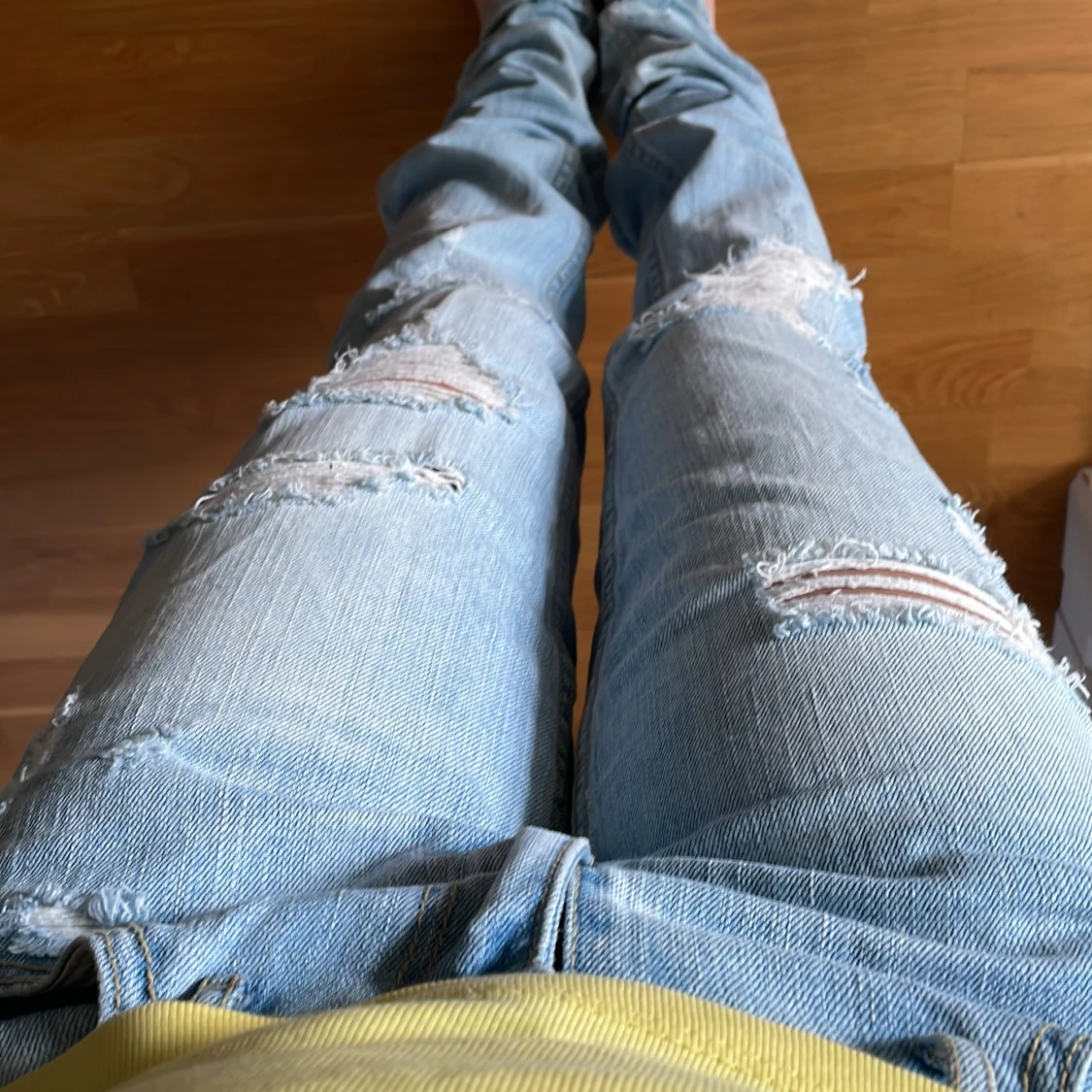 Säljer ett par ljusblå jeans från Gina Tricot med snygga slitningar och hål på benen. Jeansen har klassisk femficksdesign, raka ben och låg midja. Perfekta för en avslappnad och trendig look.❤️De är skinny men går lätt att sy ut till bootcut. Midjemått rakt över: 37cm och innerbenslängden: 78cm💓