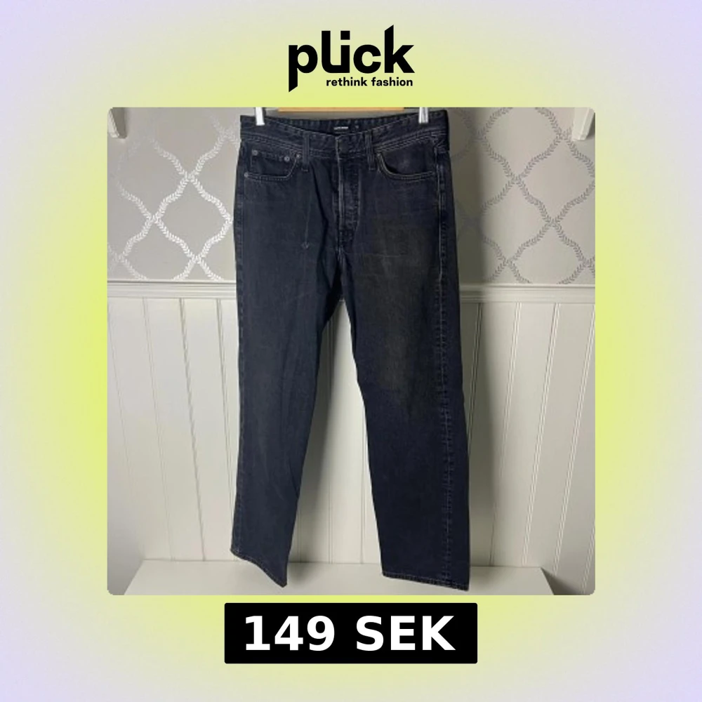 Snygga svarta jeansbyxor från Jack & Jones. Byxorna har en knappgylf och raka ben. Perfekta för en stilren look. Ett litet hål på framsidan (se sista bilden) men inget man tänker på så mycket. Kom med prisförslag!