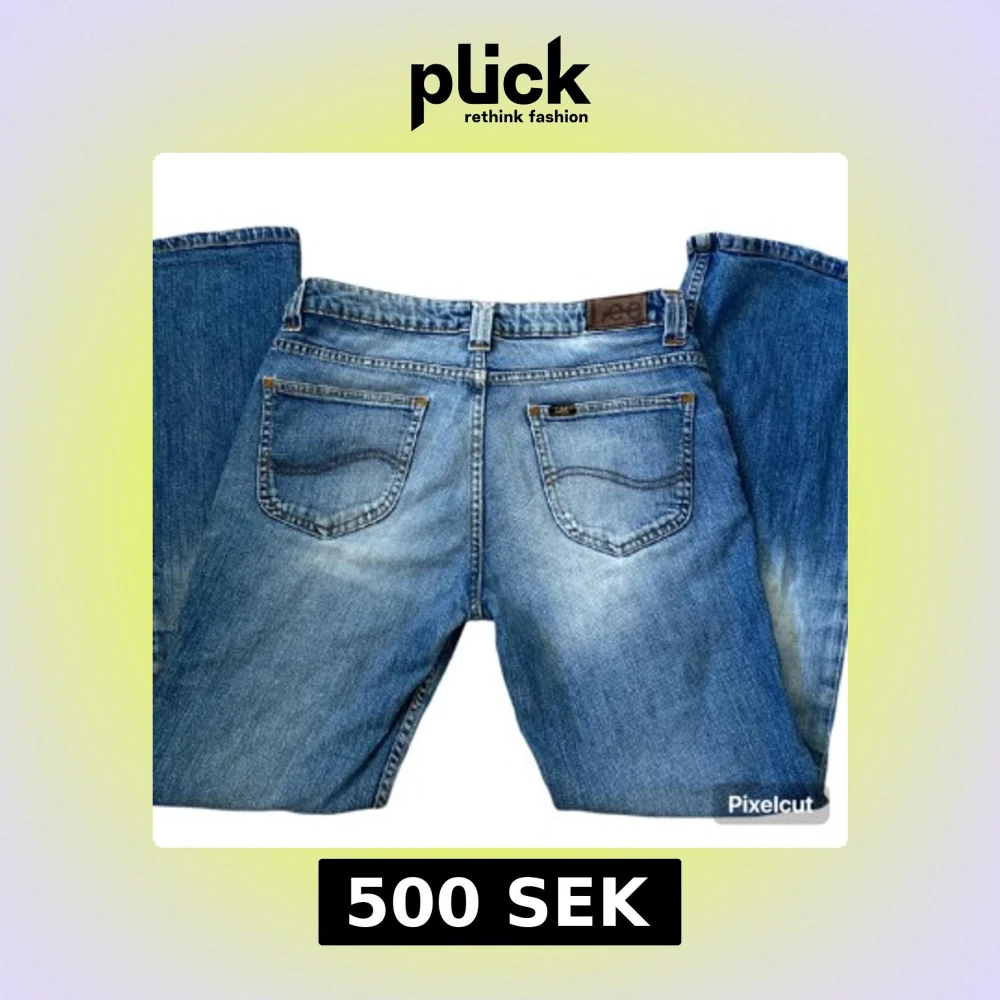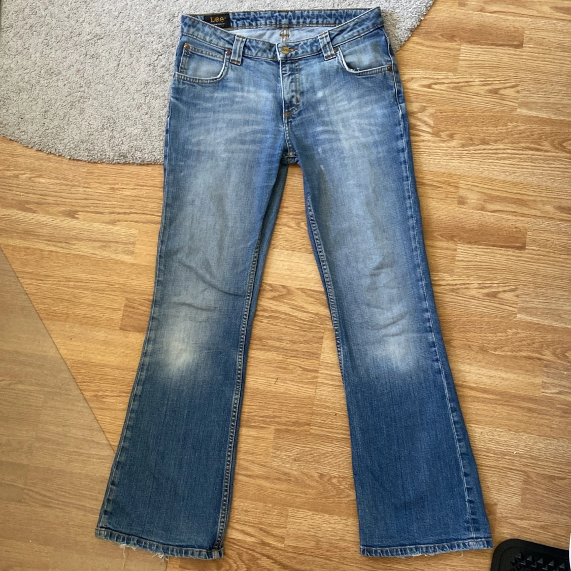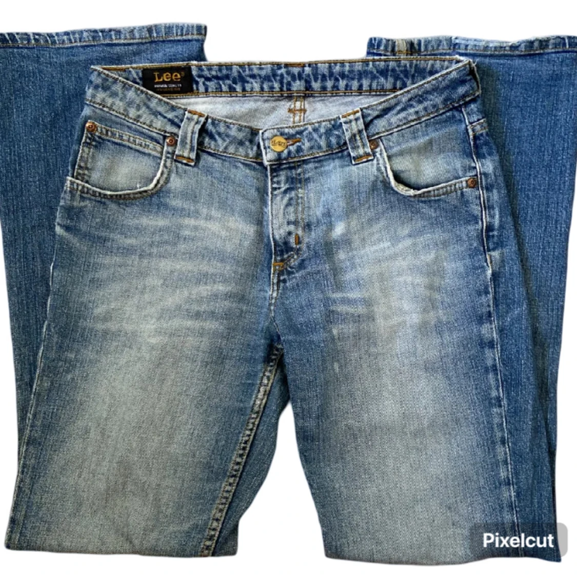 Blå vintage flared/boocut jeans från lee. Säljer då de tyvärr är för stora för mig💗Innerbenslängd: 74 cm. Midja: 82 cm och rakt över 39 cm. Grenhöjd: 23 cm.
