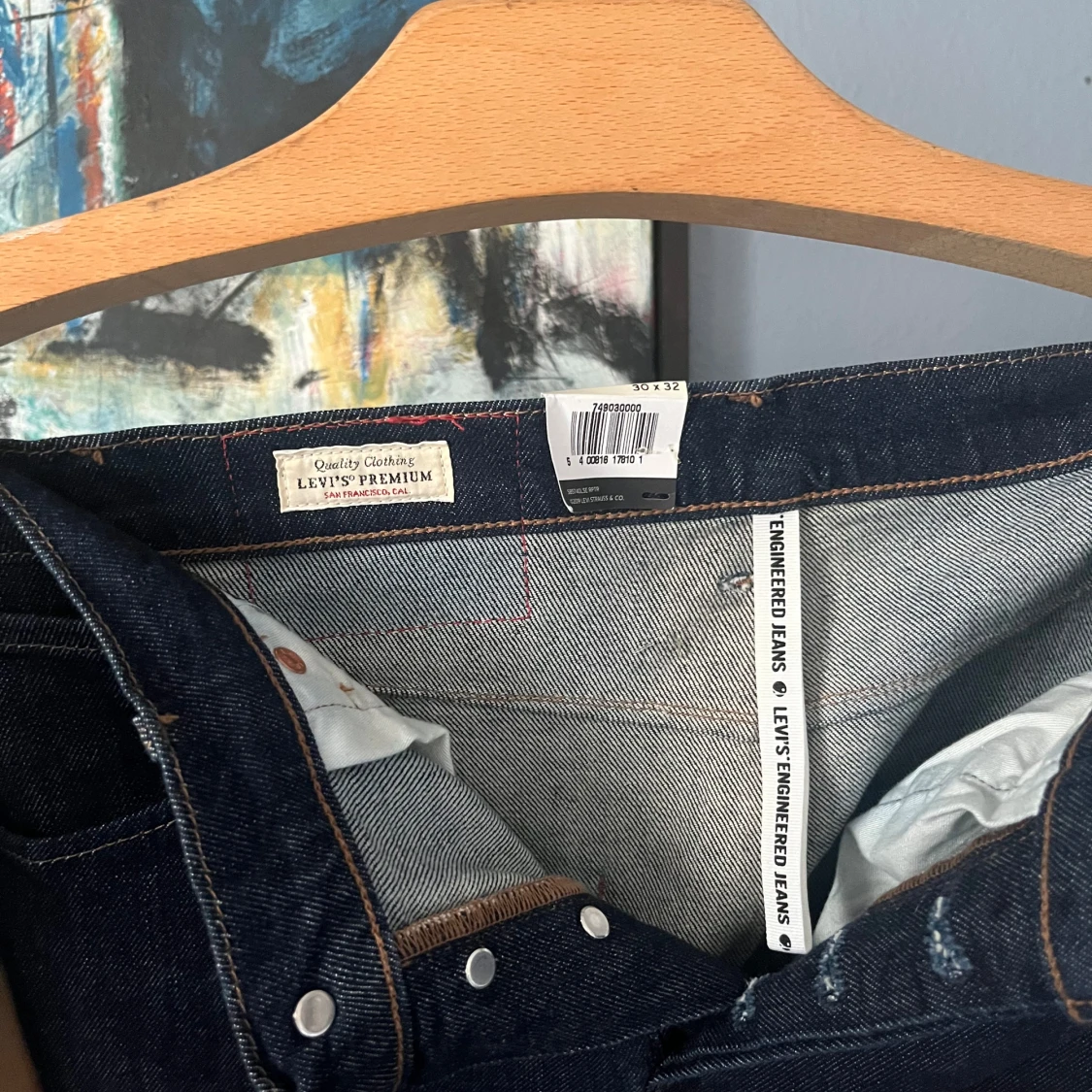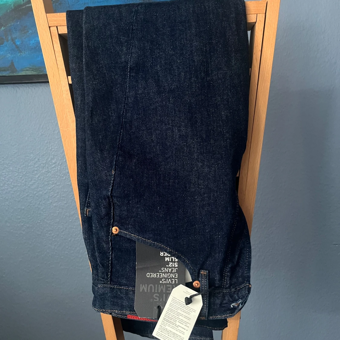 Mörkblå Levi's 512 jeans med slim taper passform. Storlek 30x32. Klassisk femficksdesign, röda Levi's-taggen på bakfickan och röd patch bak. Jeansen är tillverkade i denim och har snygga kopparfärgade nitar och knappar. Butikspriset är 1399kr.