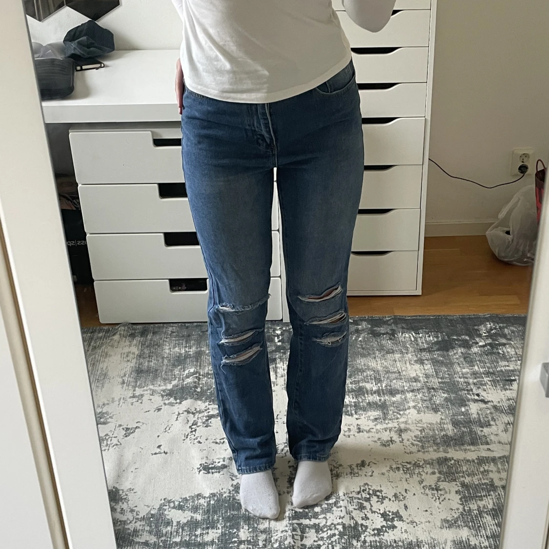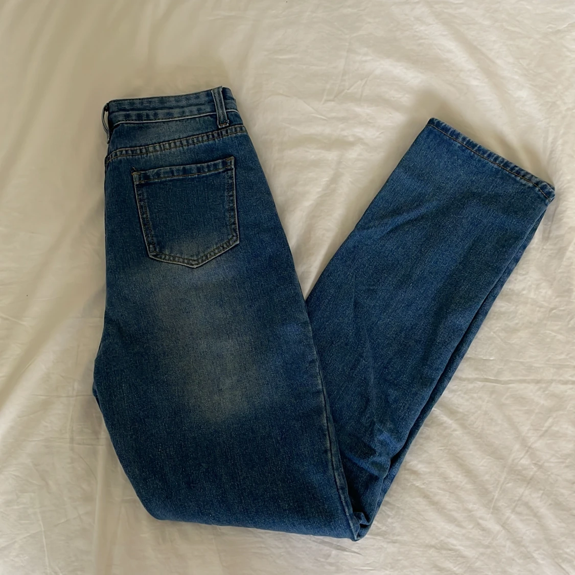 Säljer dessa snygga jeans från shein, de är högmidjade och raka i benen. Endast använda ca 2 gånger och är i nyskick. Passar jättebra till basic t shirts och tröjor, säljer då de inte kommer till användning.