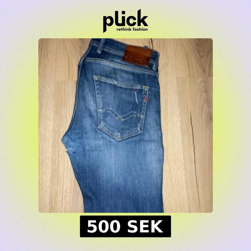Snygga blå Replay Anbass jeans med slim fit och slitna detaljer på benen. Klassisk femficksmodell med knappgylf och läderpatch bak i midjan. Jeansen har en cool tvättad look och är perfekta för dig som gillar streetstyle.