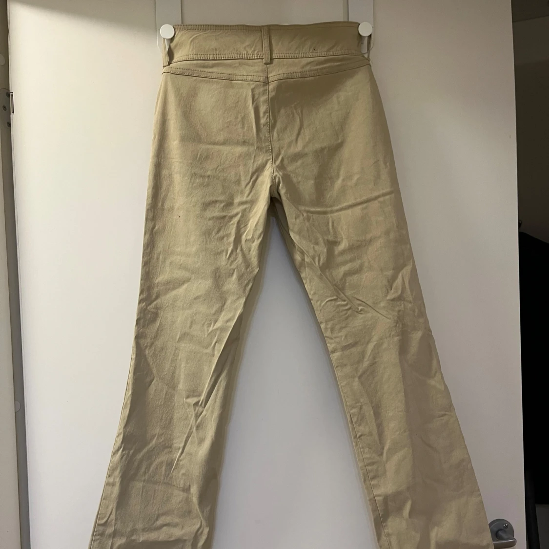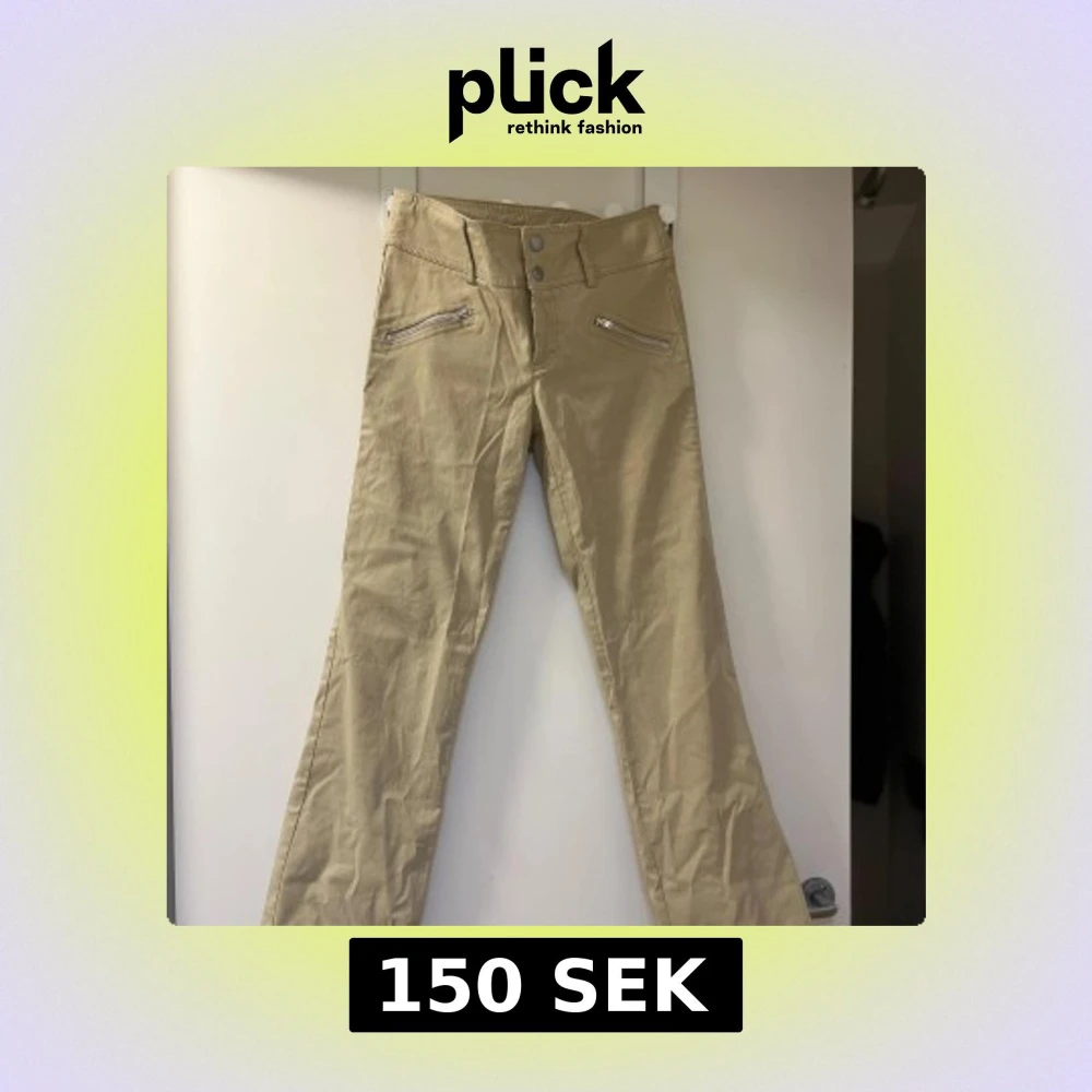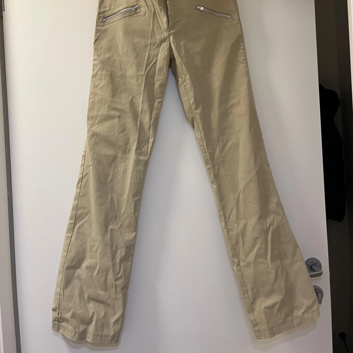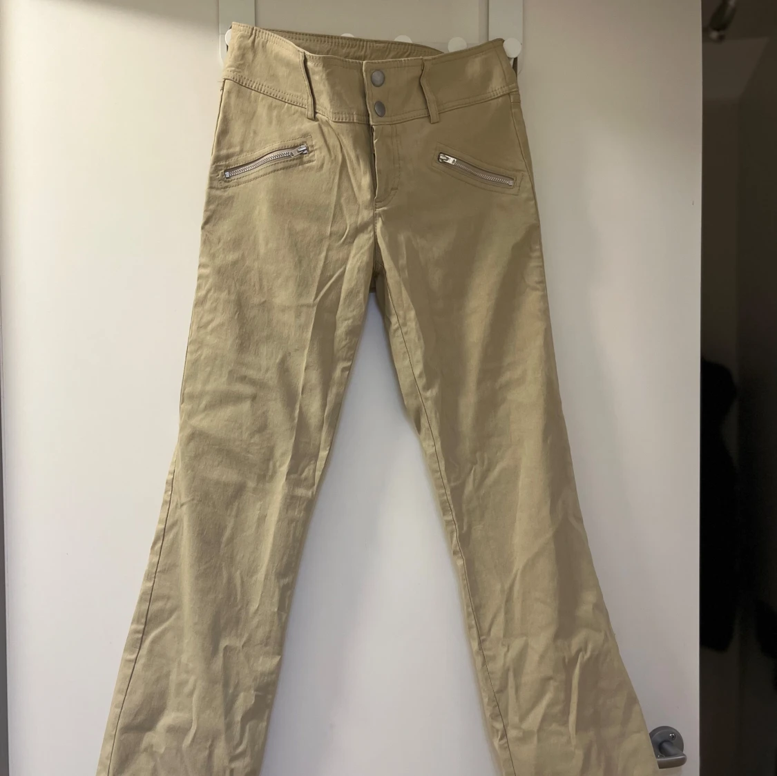 Snygga beige byxor med raka ben och dragkedjor vid fickorna. Perfekta för en stilren look. De har en låg midja med stretchigt material.