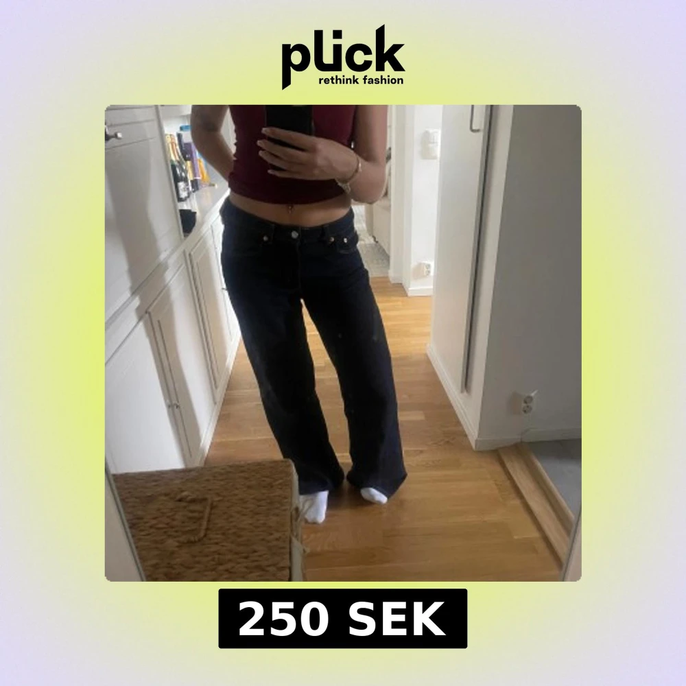 Säljer ett par mörkblå jeans med hög midja och wide fit. Klassisk femficksmodell med raka, vida ben och knappgylf. Perfekta för en avslappnad och trendig look.