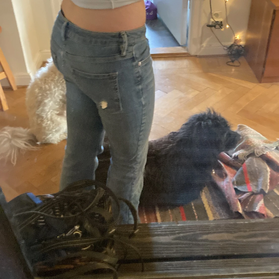 Snygga blå jeans med en klassisk look och slitningar för en trendig touch. De är högmidjade och har en bootcut passform som ger en avslappnad stil. Perfekta för en casual outfit.
