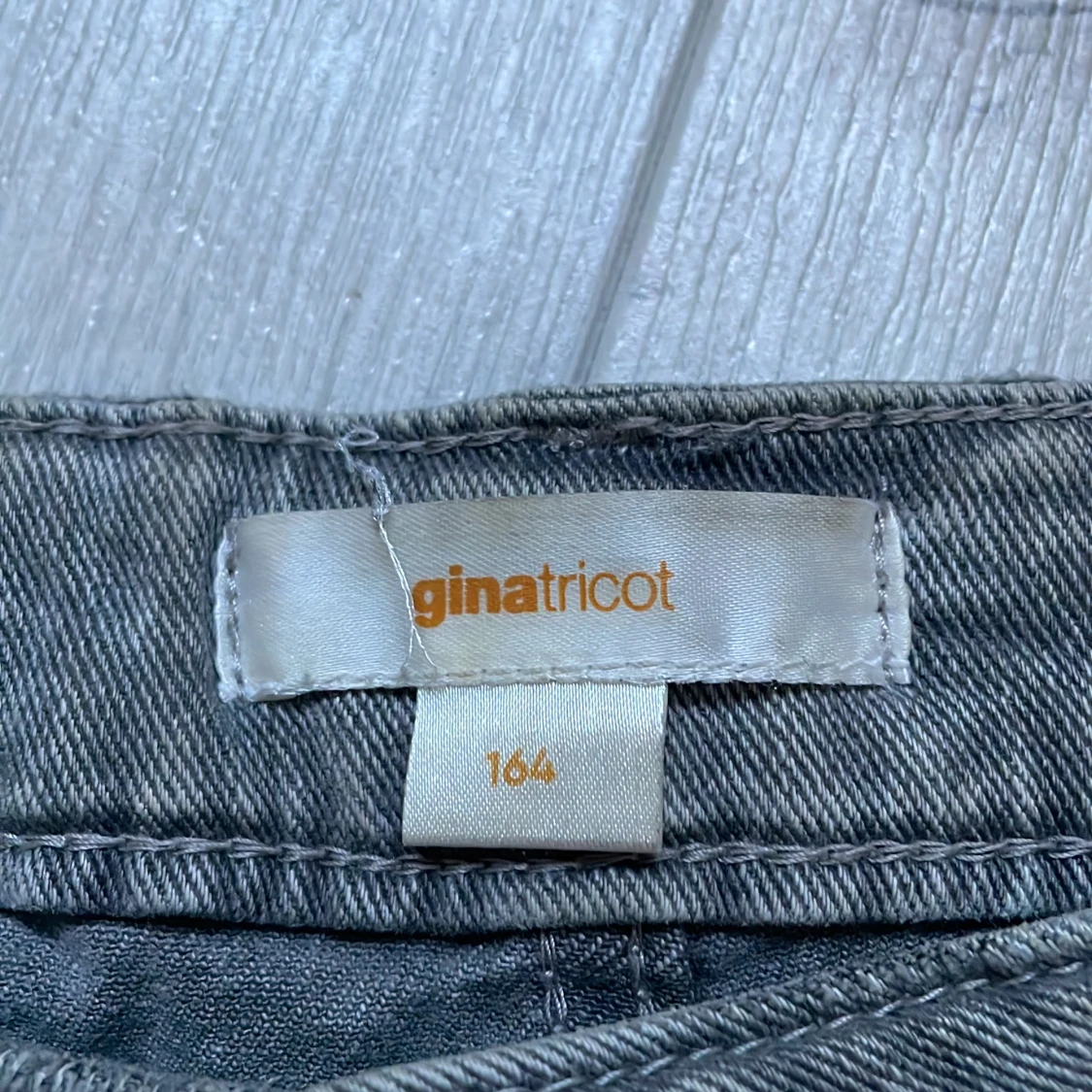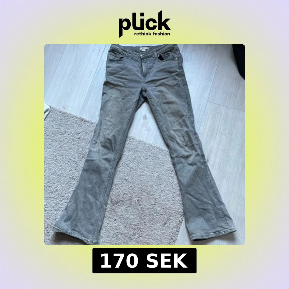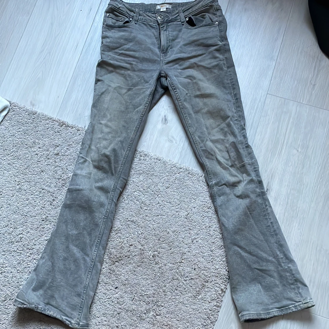 Snygga grå jeans från Gina Tricot med bootcut-stil. De har en klassisk femficksdesign och stängs med dragkedja och knapp. Perfekta för en avslappnad look.🎱🍸