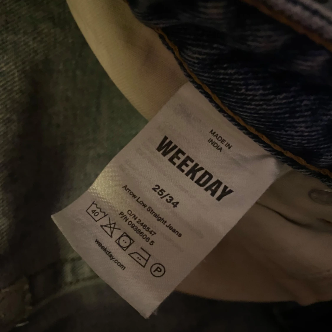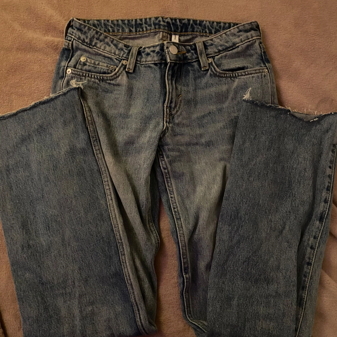Jättefina lågmidjade jeans i modellen Arrow ifrån weekday❤️dom är avklippta lägst ner endast en cm🫶 Storlek: 25- midja 34- längd nypris: 500 kr