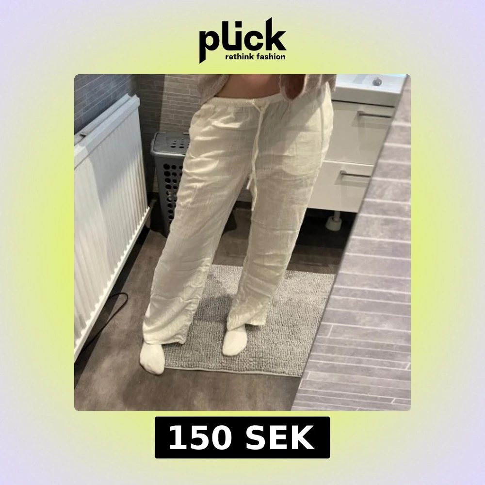 Säljer ett par vita linnebyxor. Byxorna har en avslappnad passform och raka ben, perfekta för varmare dagar. Lätta och luftiga i materialet, passar till många olika stilar.