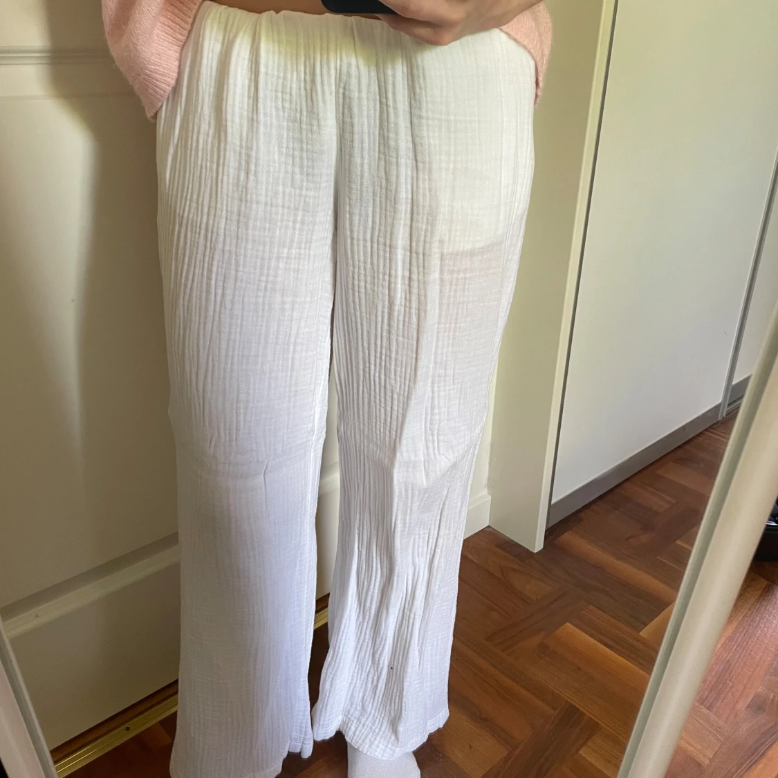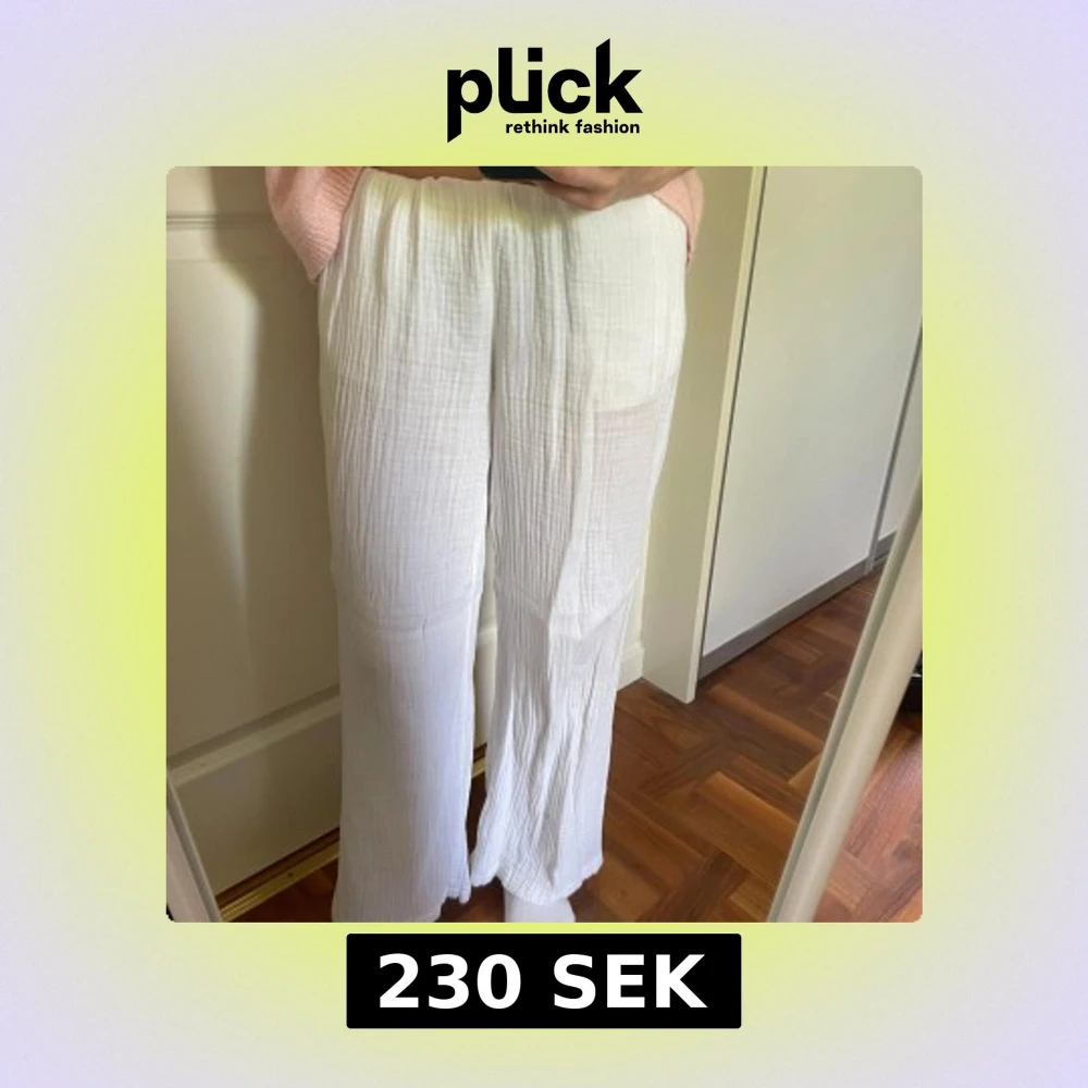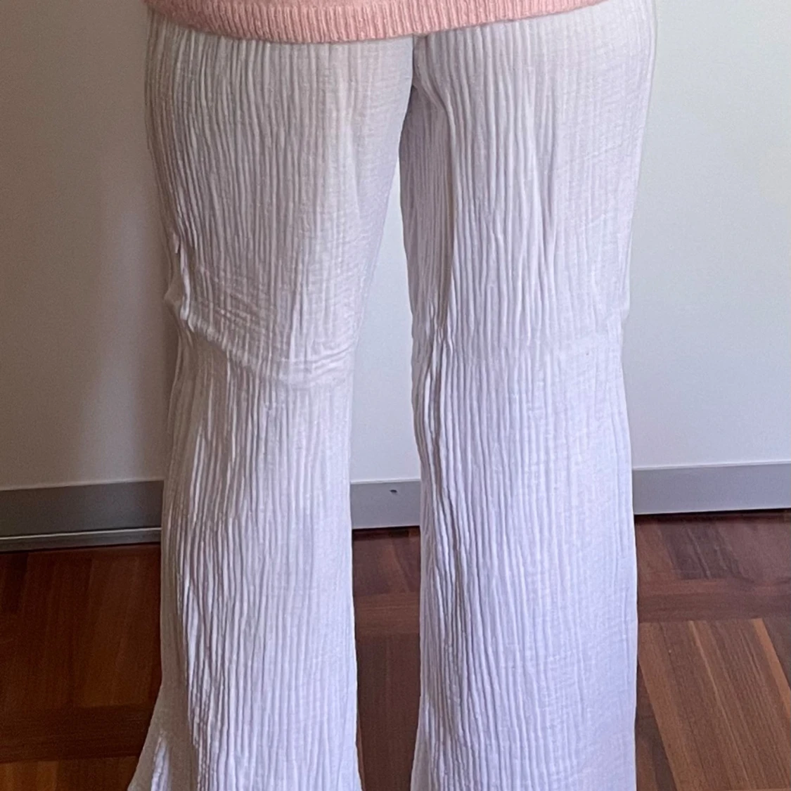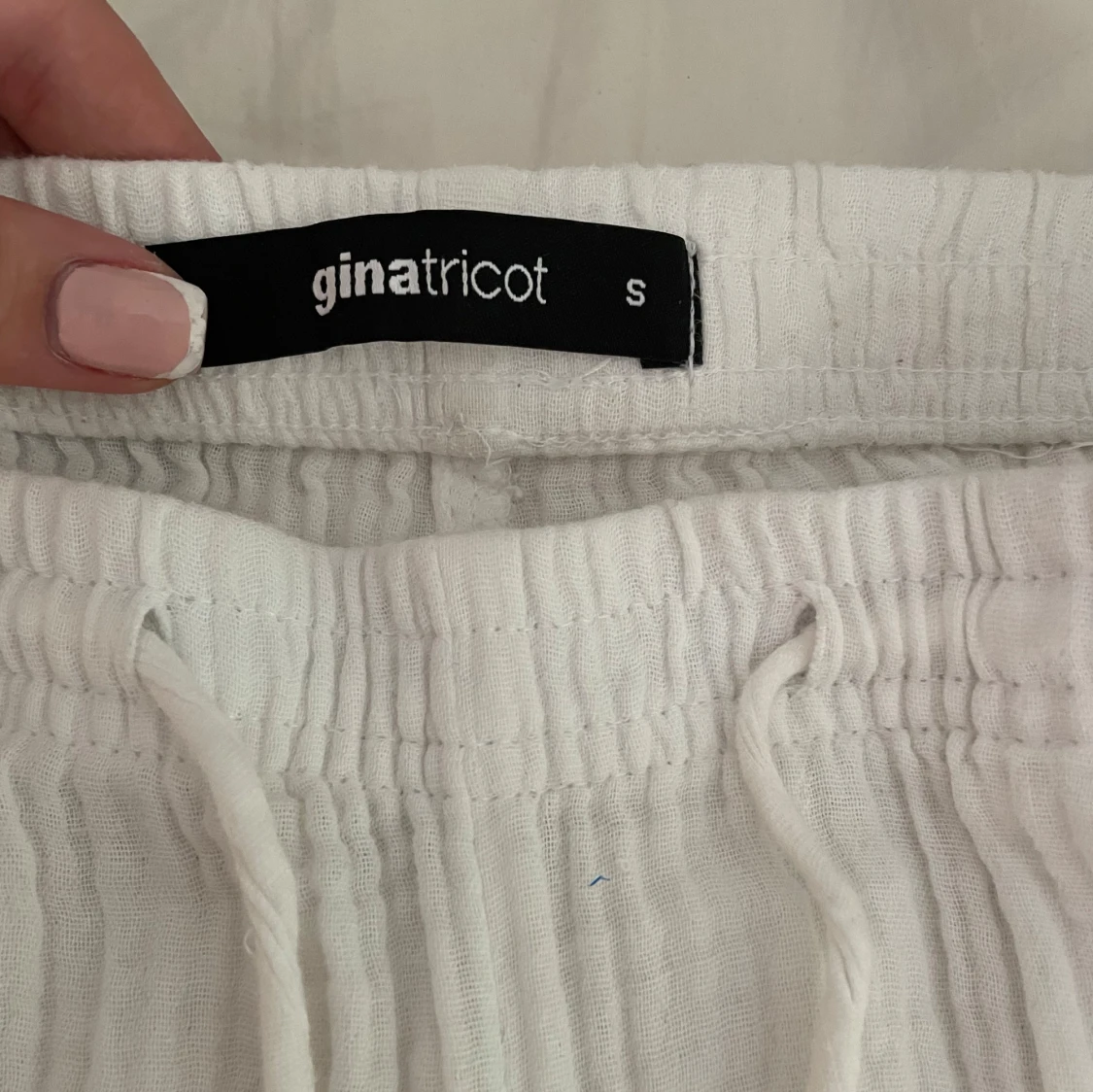 Säljer ett par vita, luftiga linnebyxor från Gina Tricot i storlek S. Byxorna har snörning i midjan samt raka, vida ben. Perfekta för varma dagar och har en avslappnad passform. Använda ett fåtal gånger, säljer då jag har flera par linnebyxor och dessa är lite för långa för mig (som är 160cm) men de går såklart att vika in i midjan.