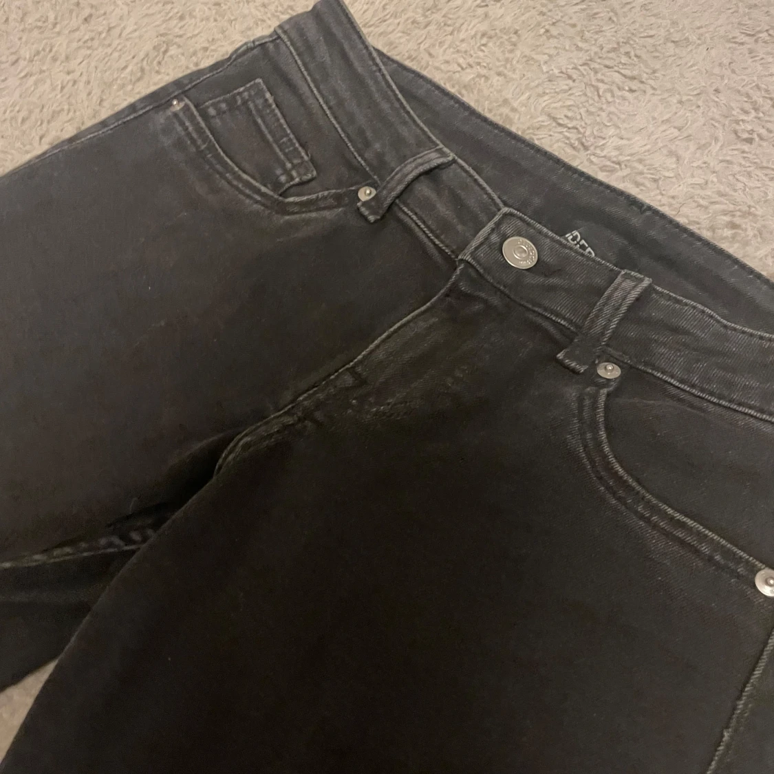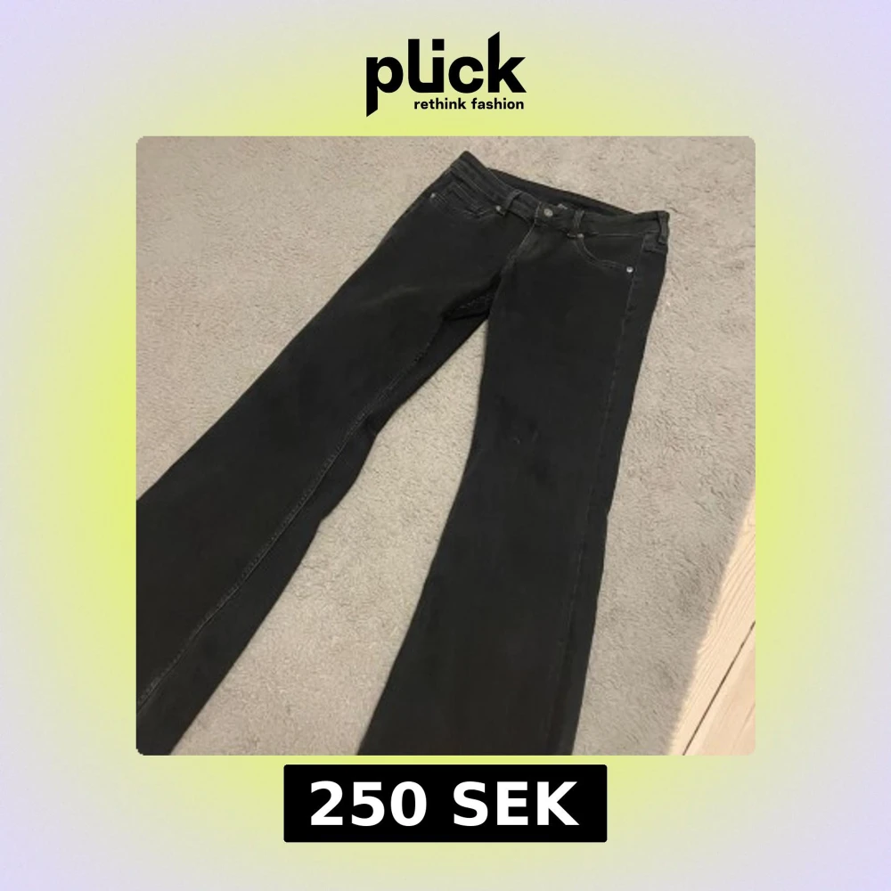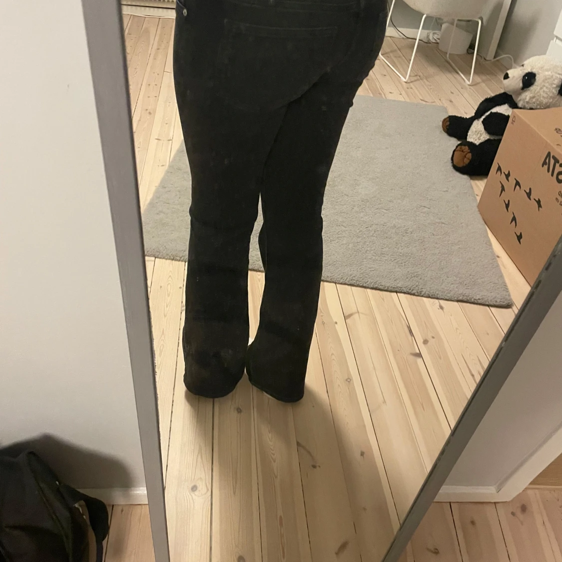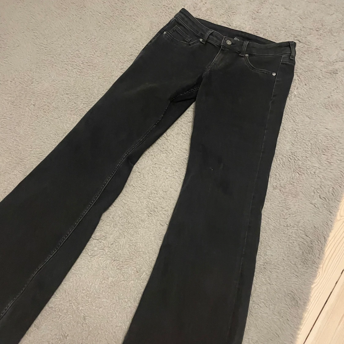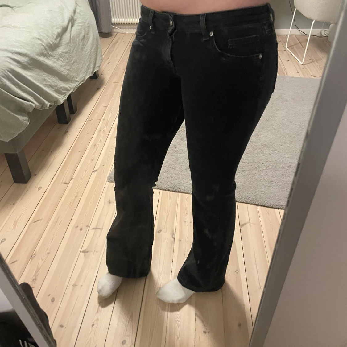 Säljer ett par svarta bootcut jeans. Jeansen har en normal passform och är tillverkade i ett mjukt denimtyg som sitter skönt på kroppen. Perfekta för dig som gillar en Stockholm stil med lite utsvängda ben.