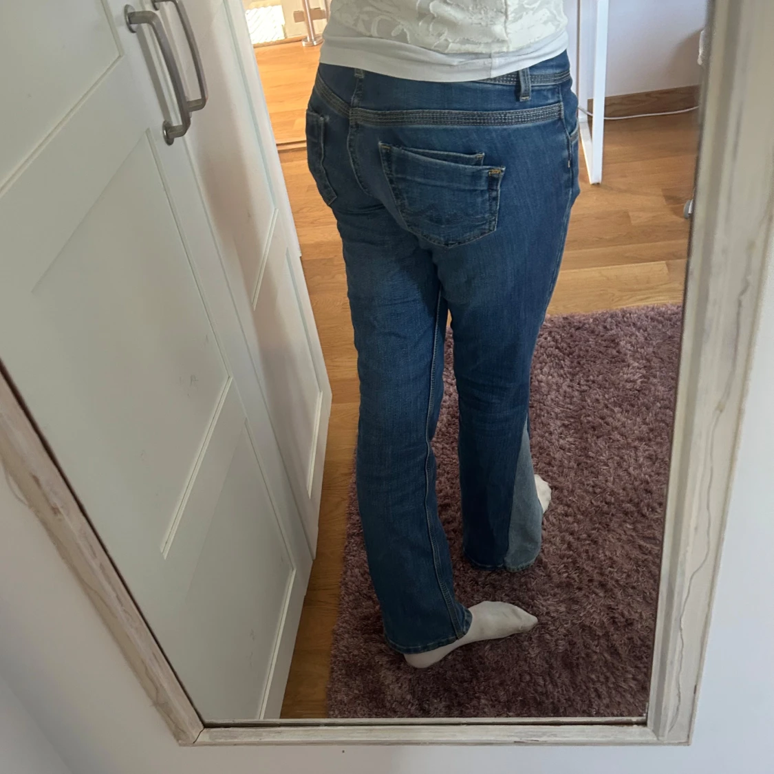 Säljer mina snygga blå bootcut jeans från Pepe Jeans. Säljer dom här bara för att de inte kommer till användning längre då jag tycker att de är snäppet för korta för min smak då jag är 171cm. Jag har själv sytt ut dom med symaskin, då jag själv inte är ett stort fan av straight jeans. Jag var väldigt noggrann när jag sydde ut som så att de inte skulle riskera att sömnen går upp. Midjemått: 36cm, innerbenslängd: 78cm. Jag skickar gärna bild på hur jag har mätt💞De har inga skador💞fler bilder finns