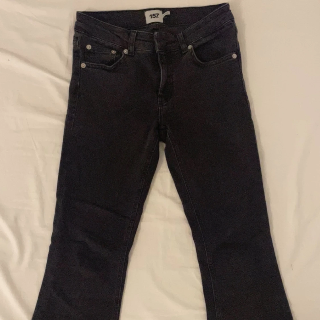 Säljer ett par svarta bootcut jeans från 157 i storlek XS. De är i bra skick och har en klassisk femficksdesign. Perfekta för både vardag och fest! 🖤