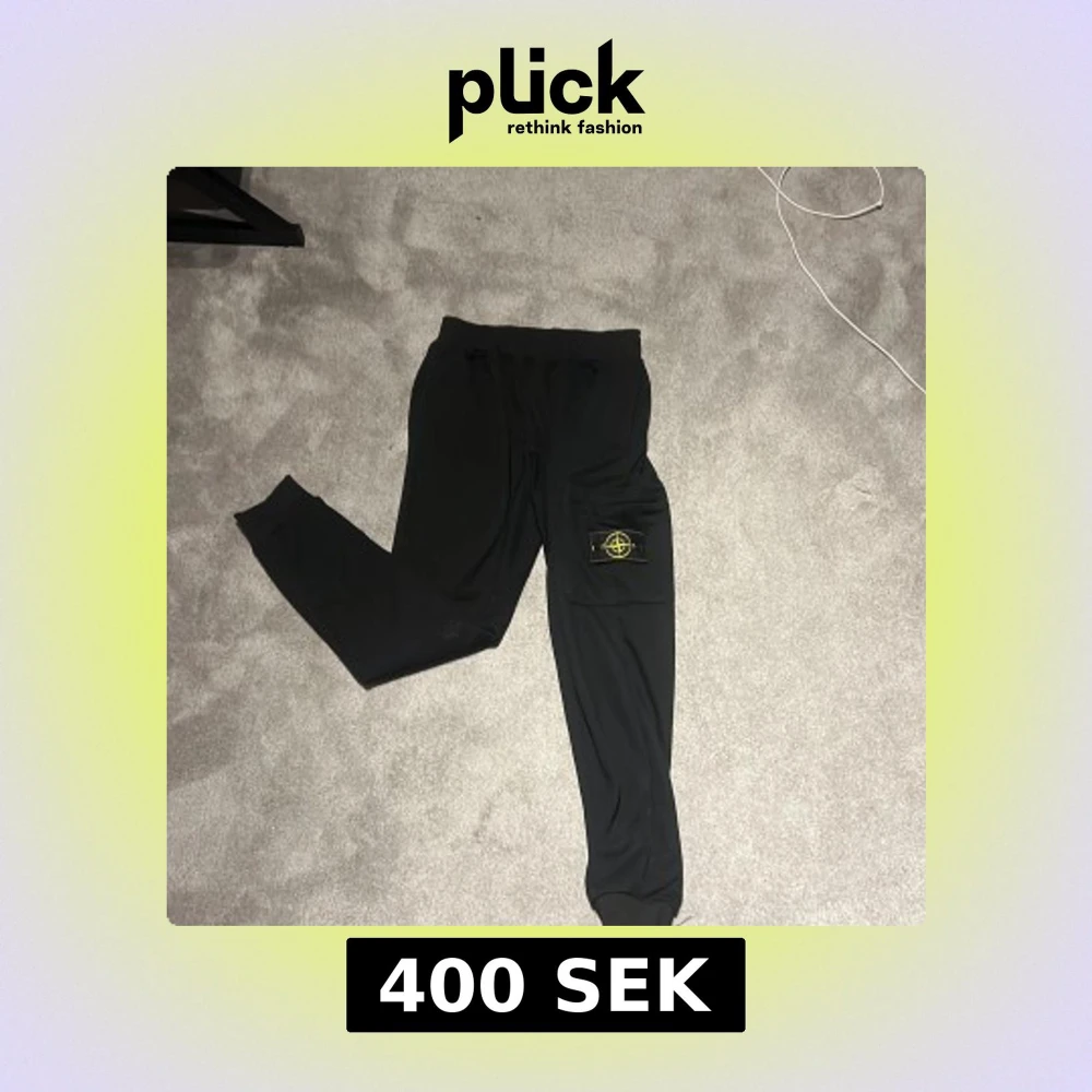 Snygga svarta byxor från Stone Island med elastisk midja och snörning. Byxorna har en praktisk ficka med det ikoniska Stone Island-märket på benet. Perfekta för en avslappnad stil.