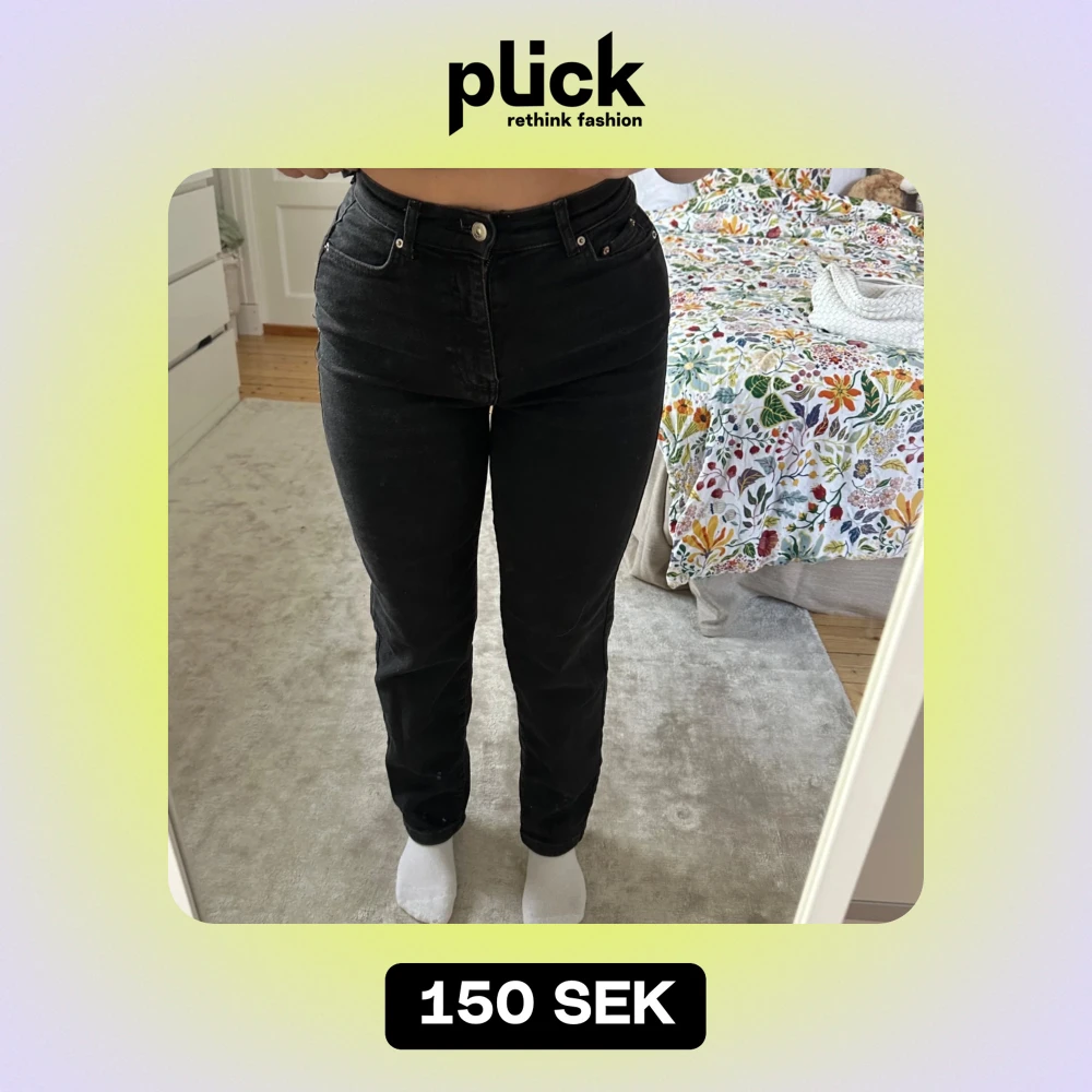 Superfina stensvarta jeans från Gina tricot i modellen comfy mom. Storlek 32 men sitter såhär på mig som är en 36. Väldigt stretchiga i storlek så passar allt från xxs-s beroende på hur tajta man vill ha dem