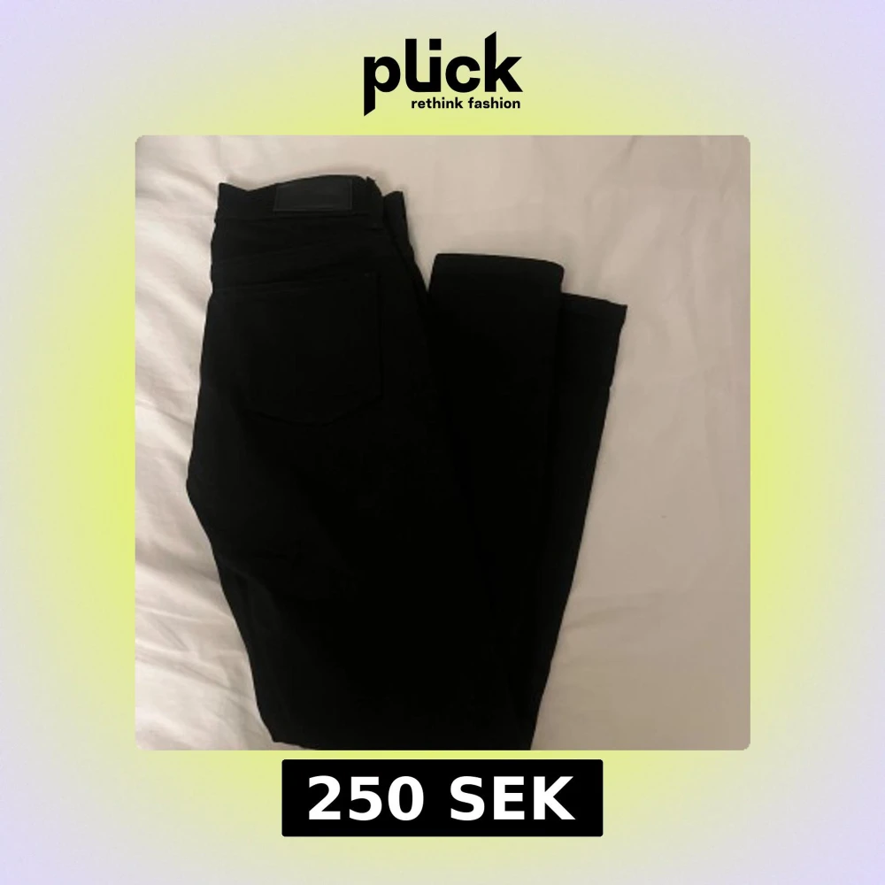 Säljer ett par svarta jeansbyxor med klassisk femficksdesign och raka ben. Byxorna har silverfärgade nitar och knapp framtill. Perfekta för dig som gillar en stilren och enkel look. Passar till det mesta och är lätta att matcha. Aldrig använda och i storlek S.
