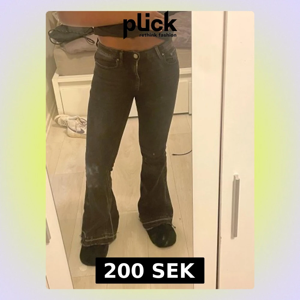 Säljer min grå flared Stradivarius jeans. De är low waist och har en väldigt unik design längst ner på bootcuten. Storlek 34 men är ganska stretchiga och passar ändå mig som har 36/38.