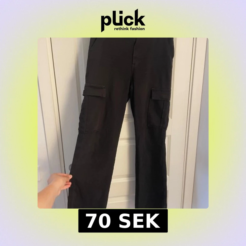 Säljer ett par svarta cargopants med raka ben och stora fickor på sidorna. Byxorna har normal passform och är tillverkade i ett mjukt bomullstyg. Perfekta för en avslappnad och cool stil.