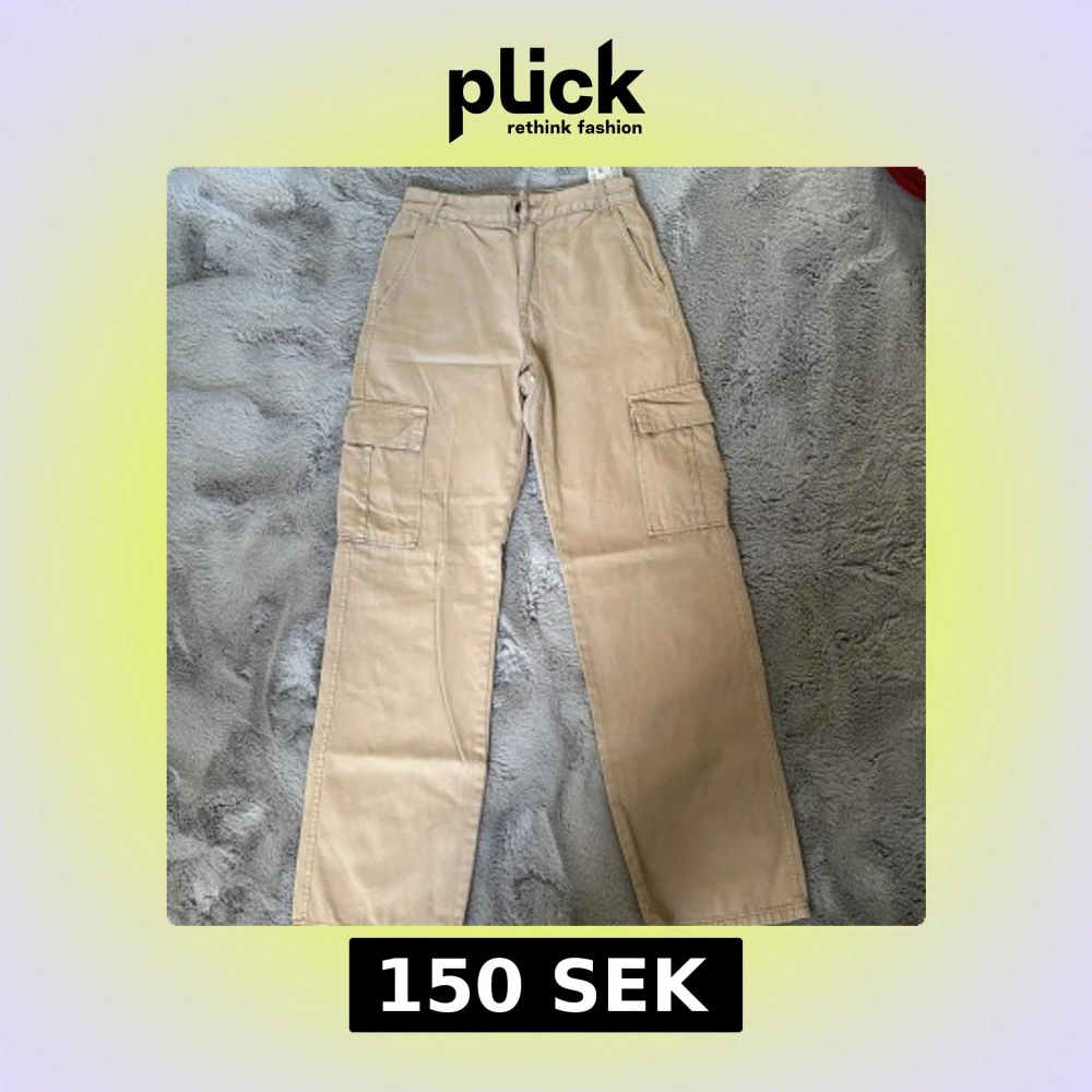 Säljer ett par snygga beige cargobyxor med praktiska fickor på sidorna. Byxorna har en normal passform och stängs med dragkedja och knapp. Perfekta för en avslappnad stil.