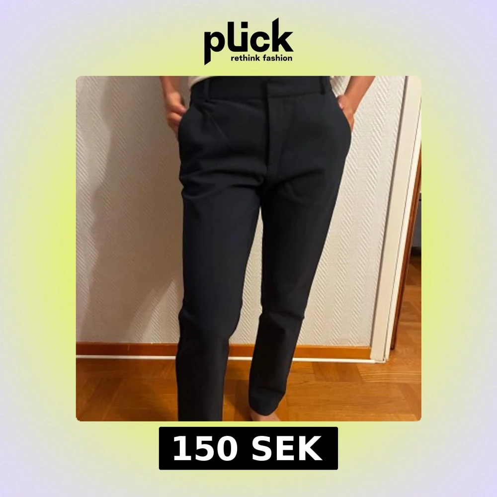 Snygga mörkblå kostymbyxor från Stradivarius i storlek 34. Byxorna har raka ben, hög midja och medföljande svart bälte med gulddetalj. Perfekta för en clean och stilren look. Materialet är mjukt och följsamt, med fickor fram och bak.