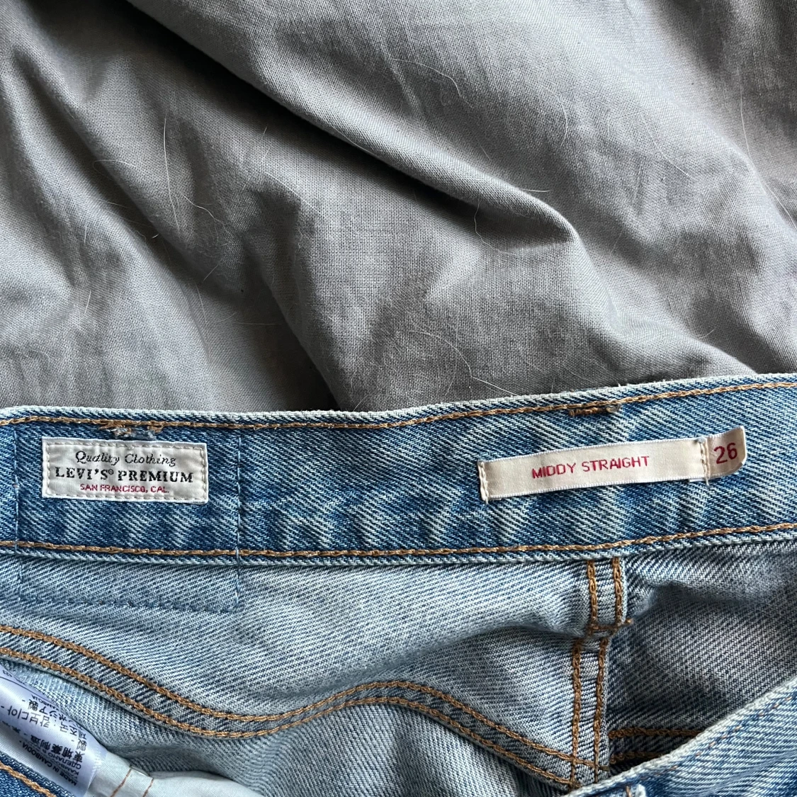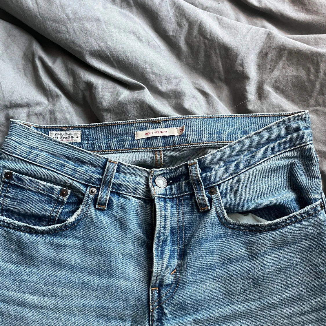 Säljer ett par Levi's jeans i modellen Middy Straight i ljusblå tvätt. Super fint skick, endast lite slitna nere vid kanten (skriv för fler bilder). Midje storleken är 26, men är osäker på längden. Skulle säga att de passar de som är mellan 160-165