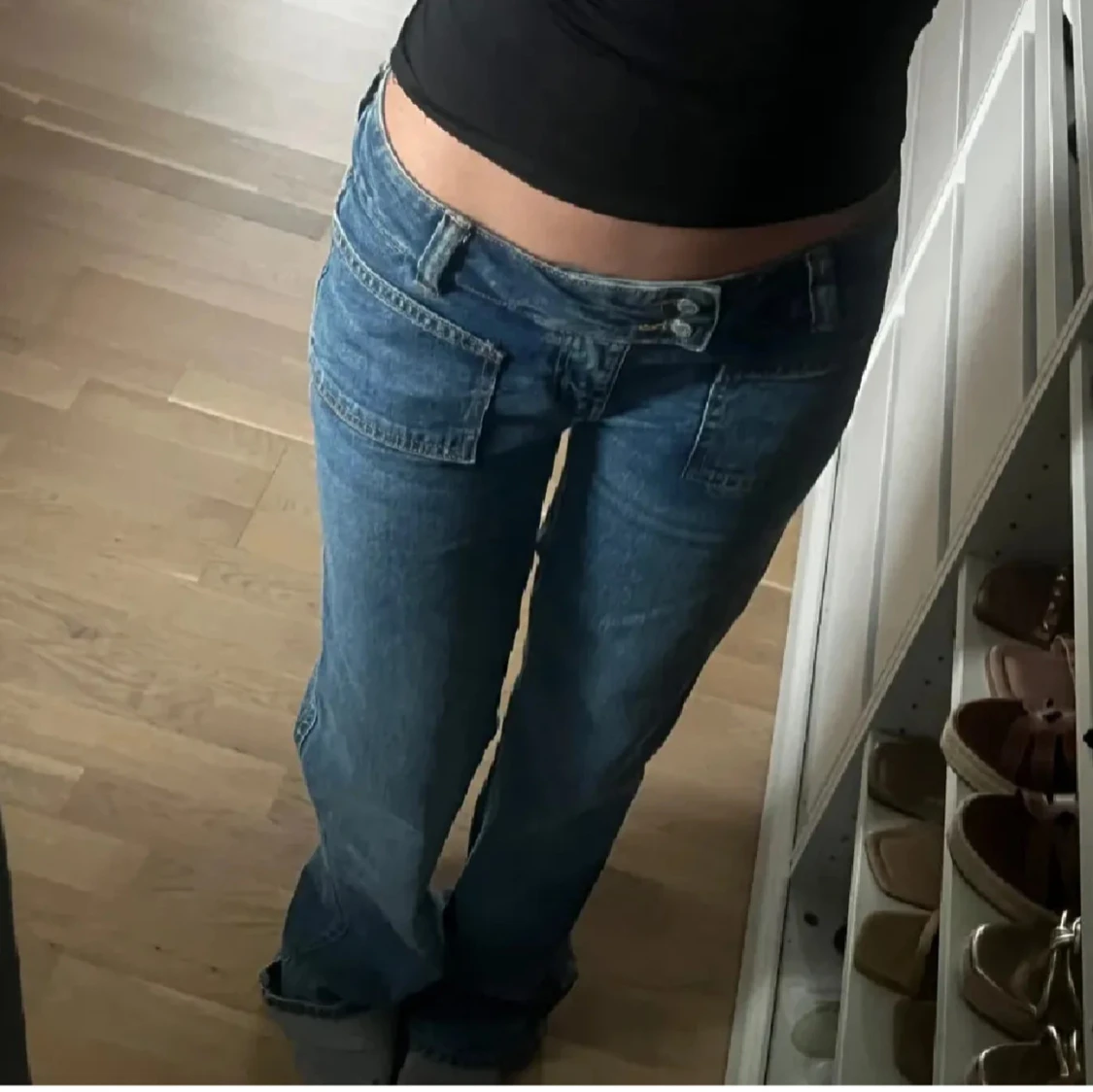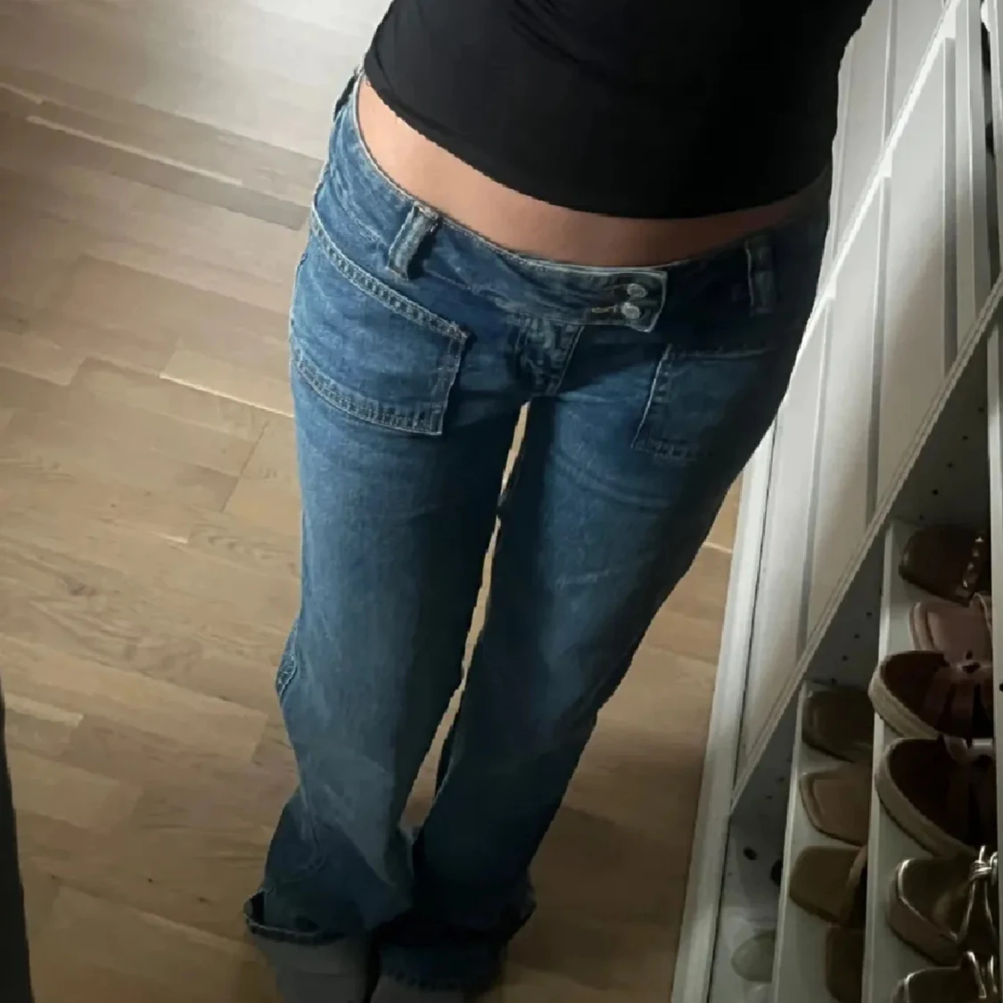 Säljer ett par mörk blå jeans med väldigt låg midja och rak passform. Tror byxan är klassad som straight men sitter ungefär som bootcut eftersom dem sitter bra vid låten men börjar bli större precis över knäna. Har en enkel design med fickor fram och bak samt två knappar och dragkedjestängning. De som är bra me byxan är att den inte är lika låg där bak så man flashas inte när man sitter ner. Köptes för 500kr säljer för 290(:🫶🏼🫶🏼💫som nya