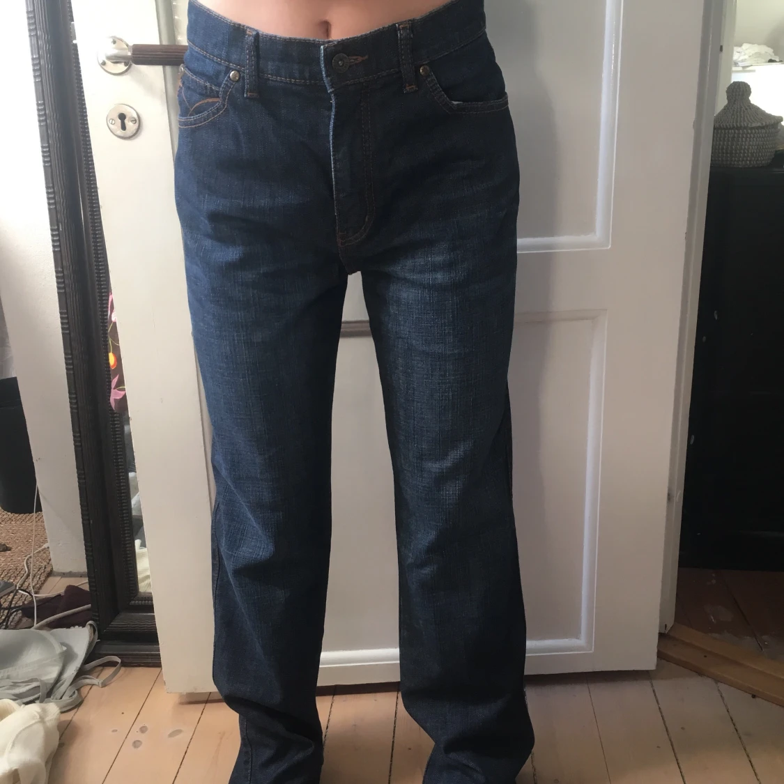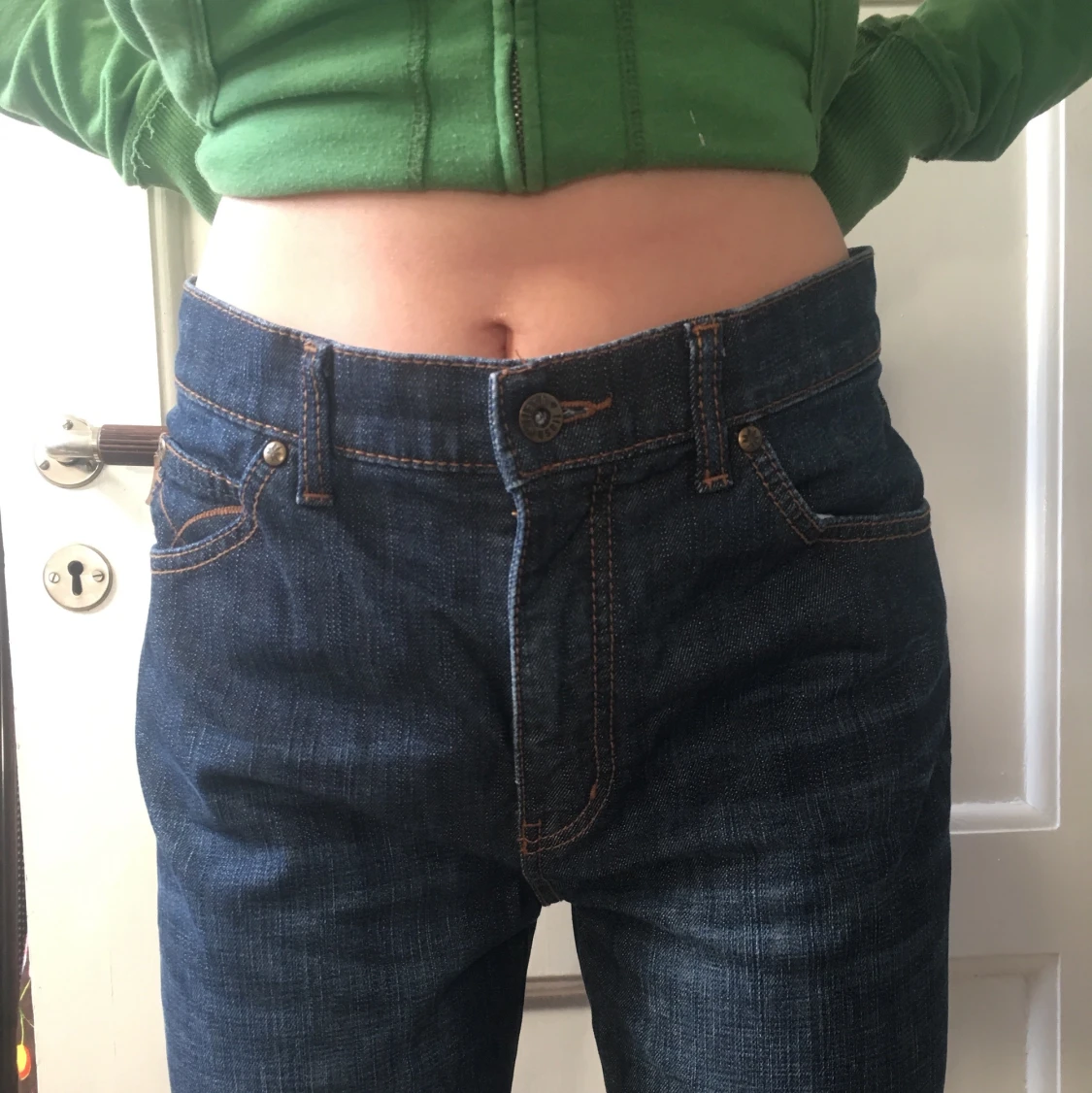 Mörka raka jeans i fint skick med högre midja oklar storlek men modellen på bilden är 167 cm. Passar någon längre alternativt om man syr upp dem något