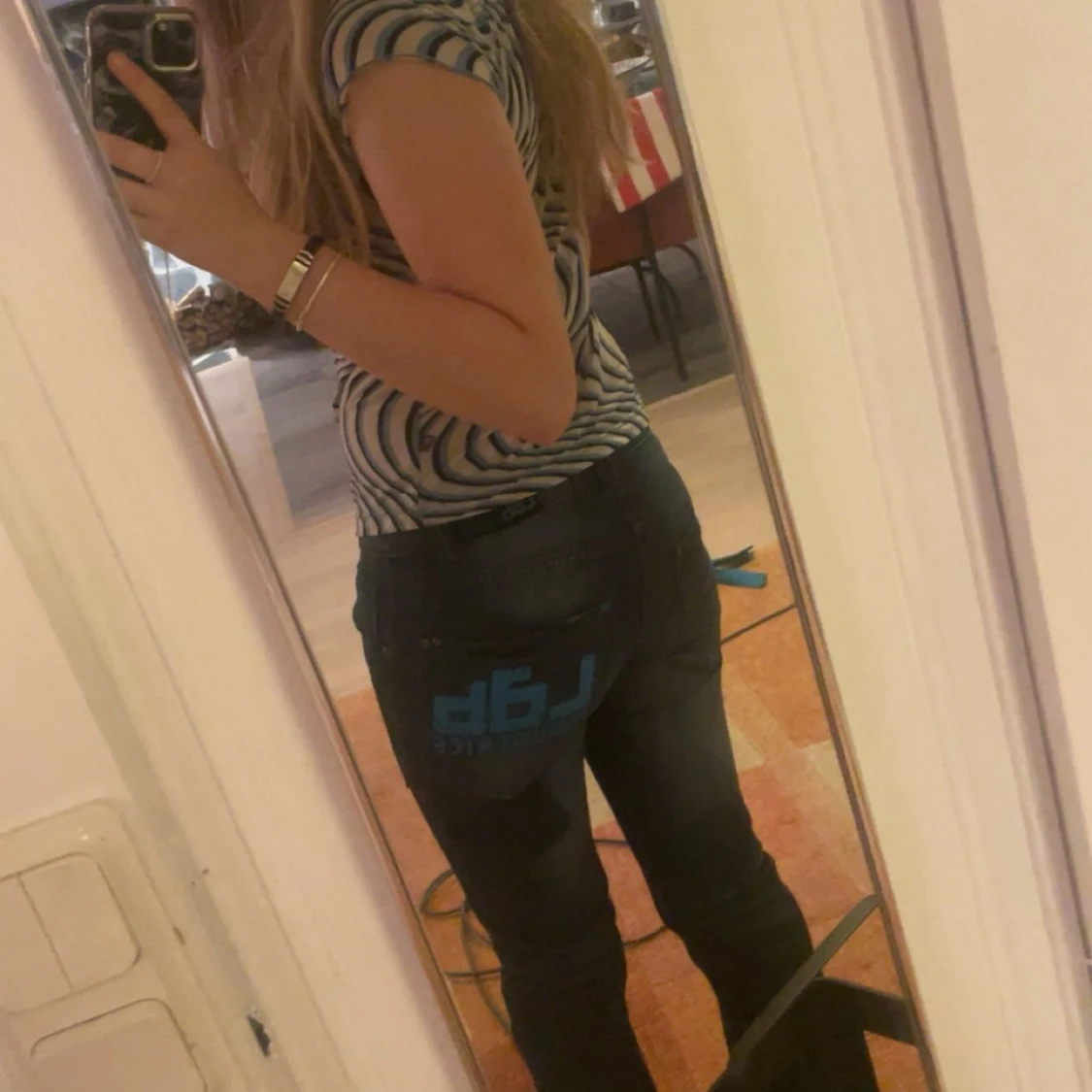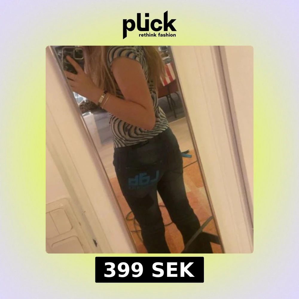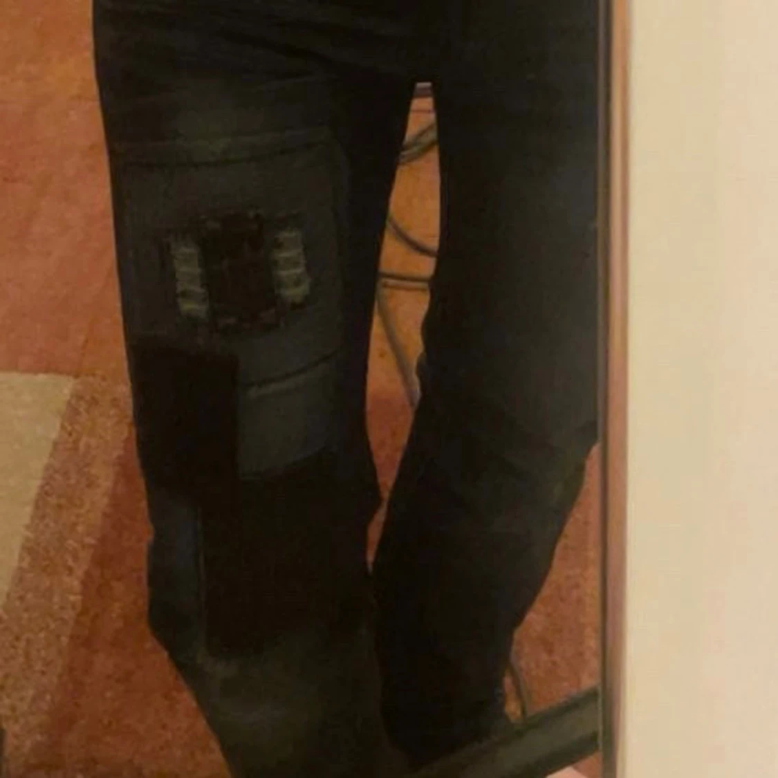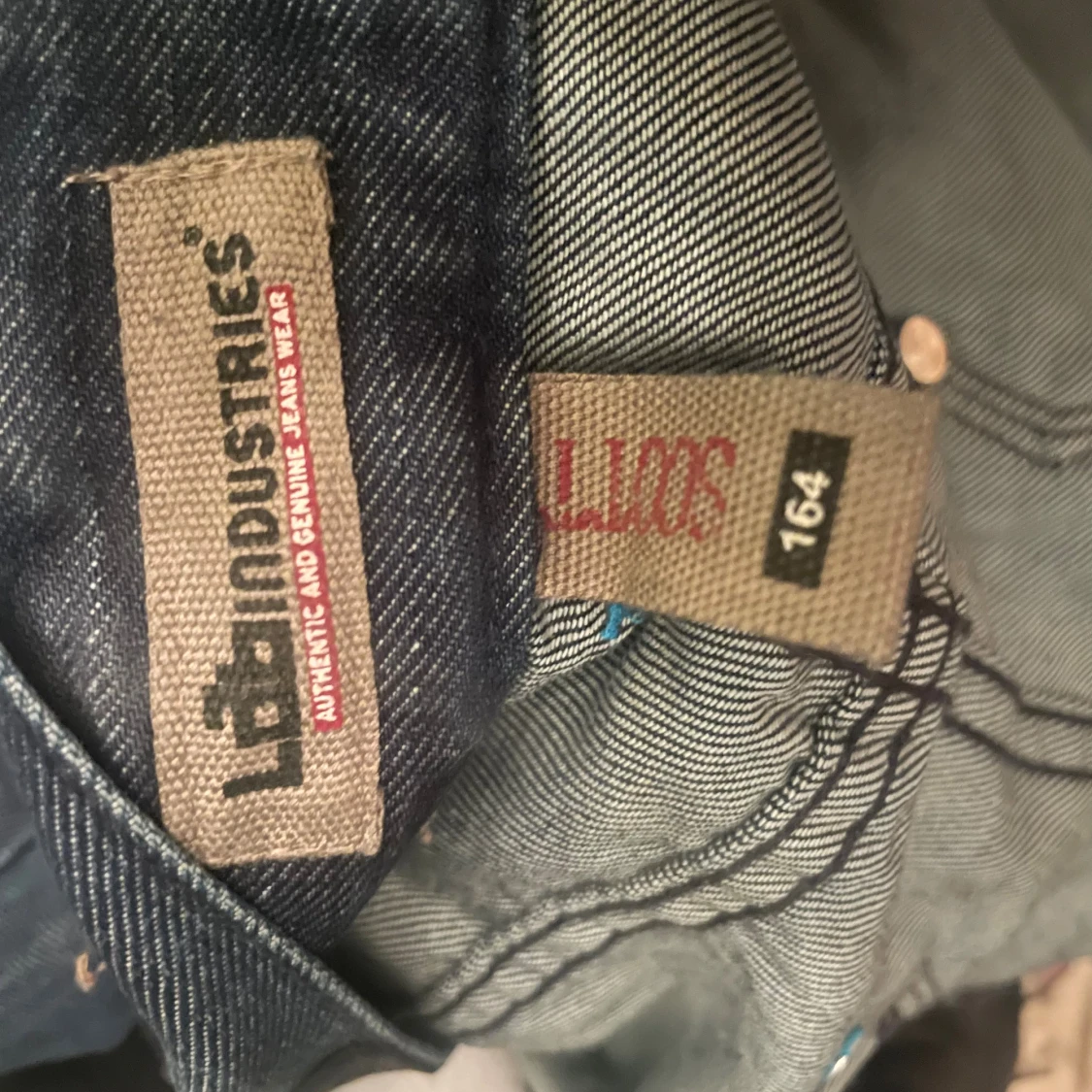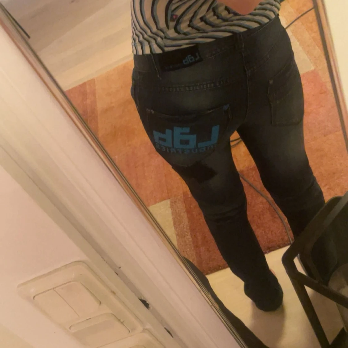 Säljer ett par mörkblå jeans från LJ Industries med blått tryck på bakfickan och coola patchade detaljer på benen. Jeansen har en rak passform och klassisk femficksdesign. Perfekta för dig som gillar streetstyle och unika detaljer.