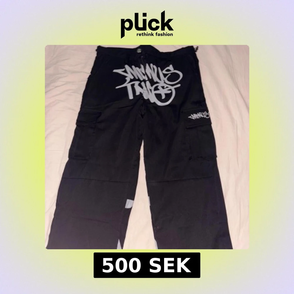 Säljer ett par svarta cargopants med stora gråa grafitti-tryck både fram och bak. Byxorna har flera fickor på sidorna och baktill, samt bred passform för en avslappnad streetstil. Perfekta för dig som gillar unika detaljer och urban look.