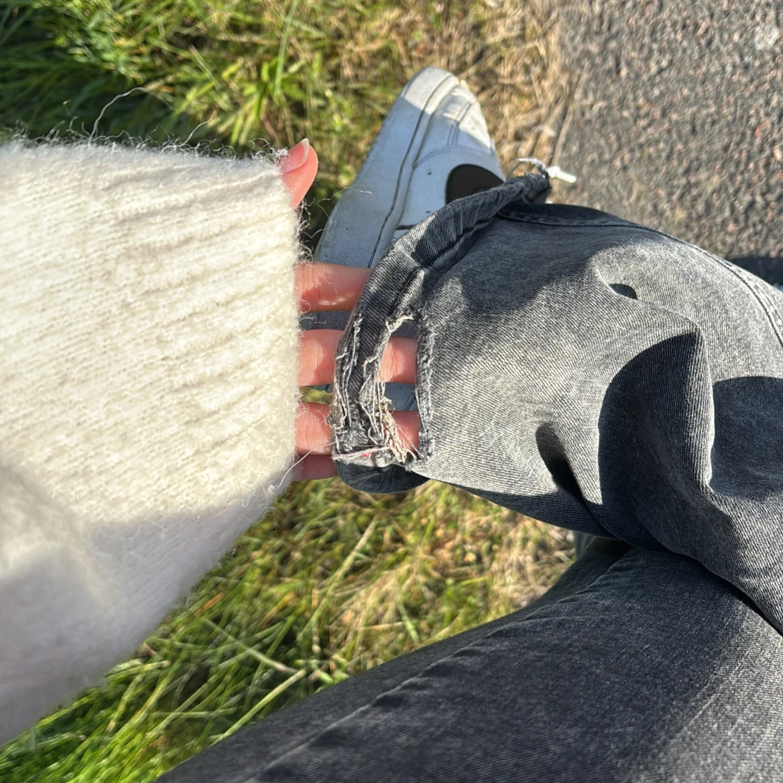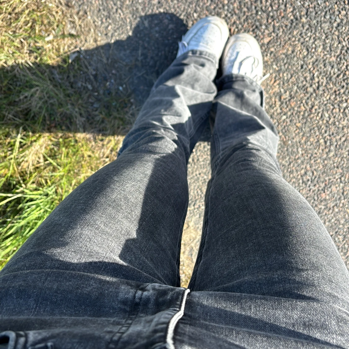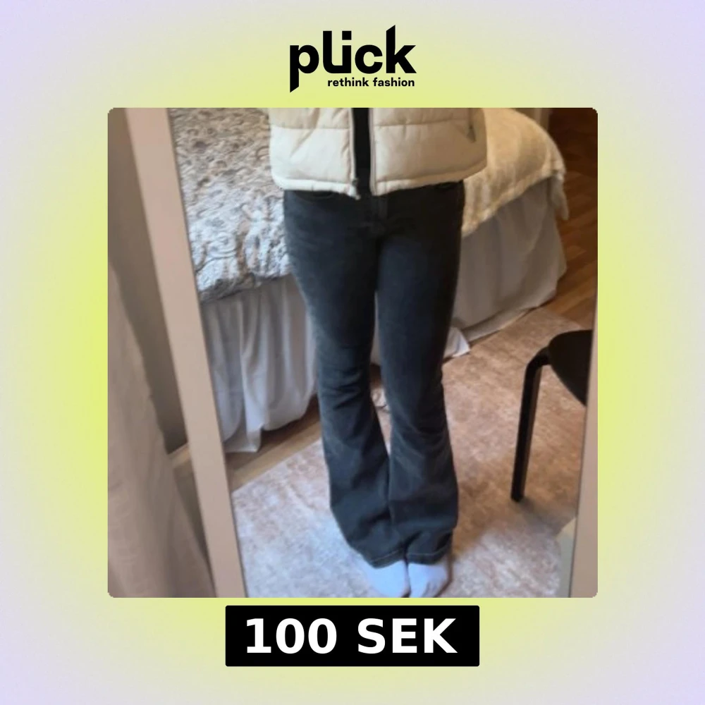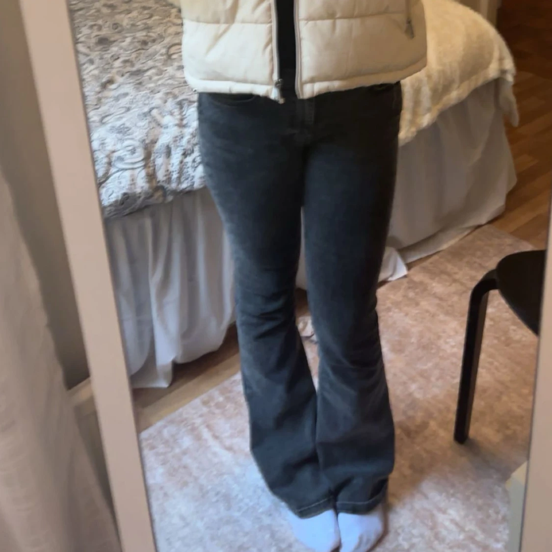 Säljer ett par grå bootcut jeans med slitna och fransiga benslut. Jeansen har normal passform upptill och är utsvängda nertill. Klassisk femficksmodell med dragkedja och knapp framtill. Perfekta för en avslappnad och trendig look. Lite slitna i bensluten men absolut inget man tänker på