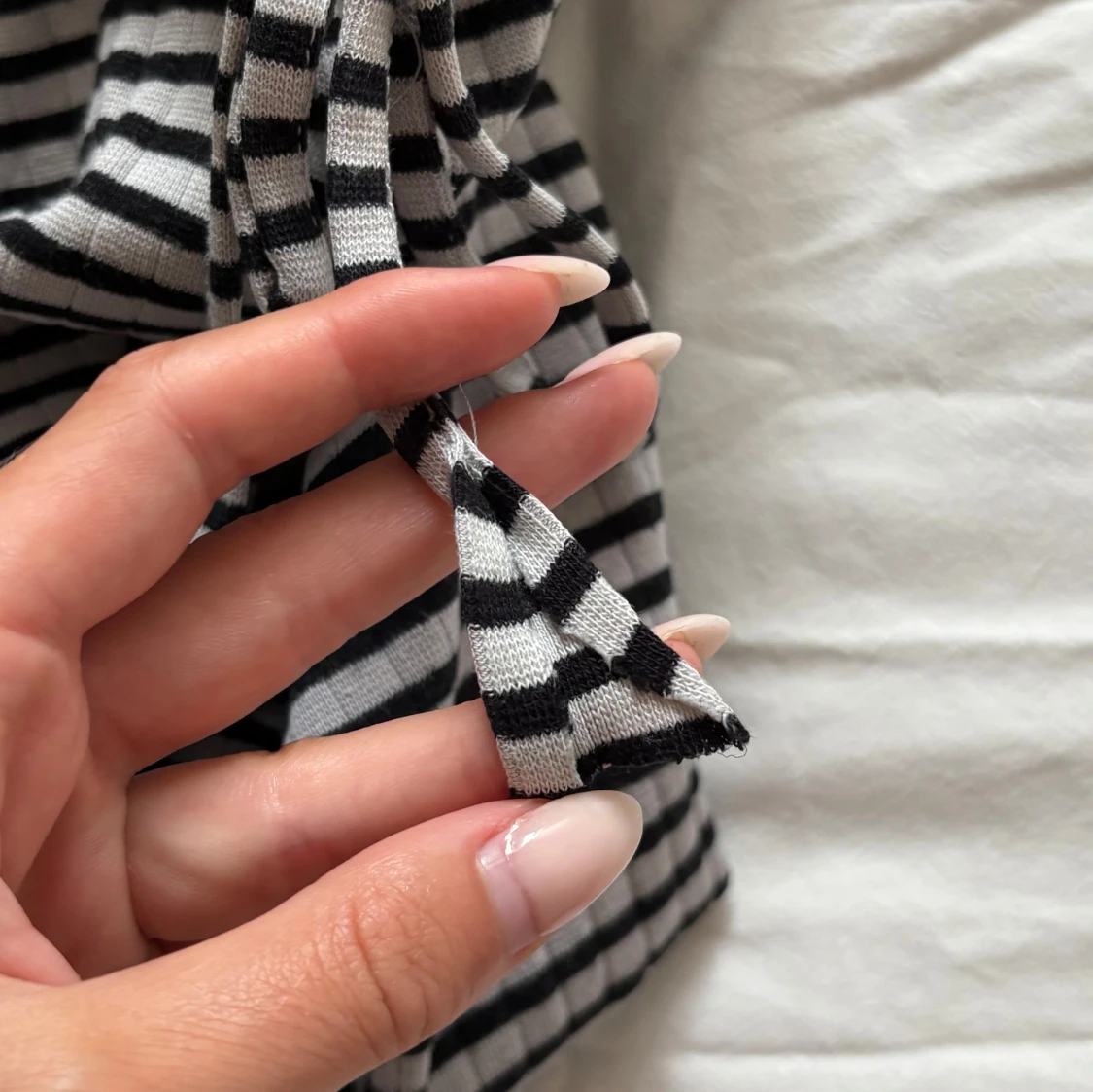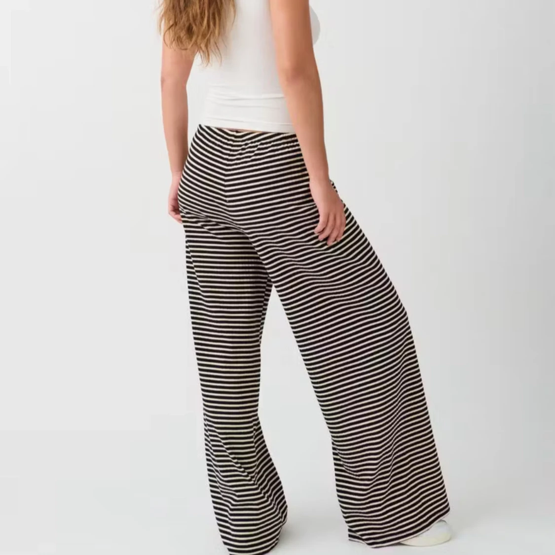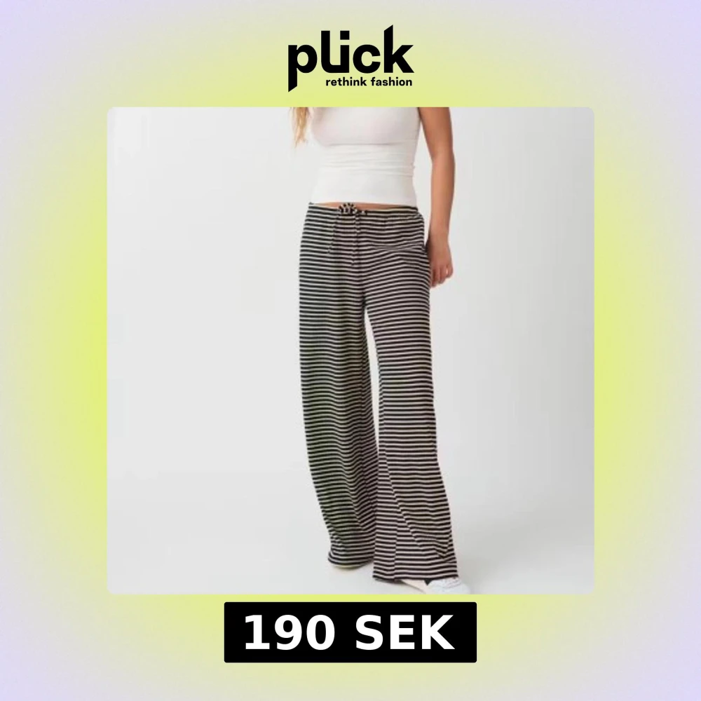 Randiga byxor med låg midja. Byxorna är svarta, vita och raka. De har mjuk kvalitet, knytbar dragsko i midjan och normallängd.