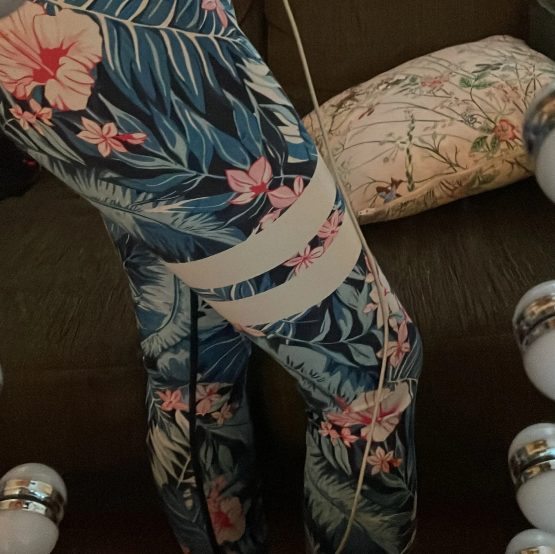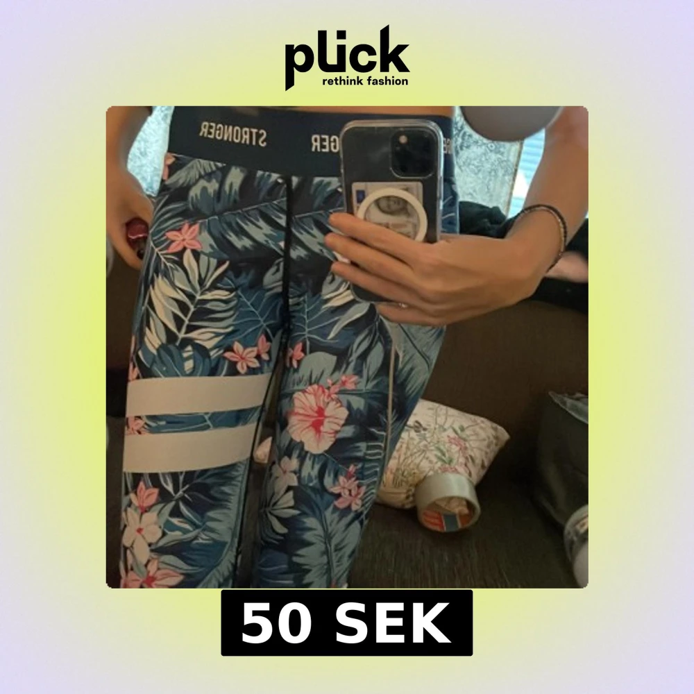 Säljer ett par snygga leggings från Stronger med tropiskt blommönster i blått, vitt och rosa. De har hög midja och bred resår med logga, samt två vita ränder på ena benet. Perfekta för träning eller chill.
