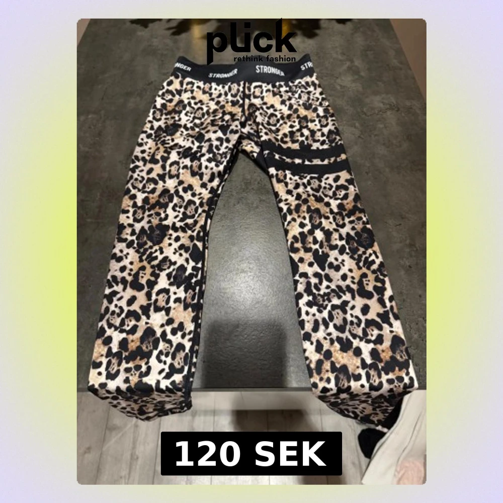 Snygga leopardmönstrade leggings från Stronger med bred svart midja och logga. De har en tight passform och är gjorda i stretchigt syntetmaterial som passar perfekt för träning. Färgerna går i beige, svart och bruna toner med coola svarta detaljer på benen.💞💞
