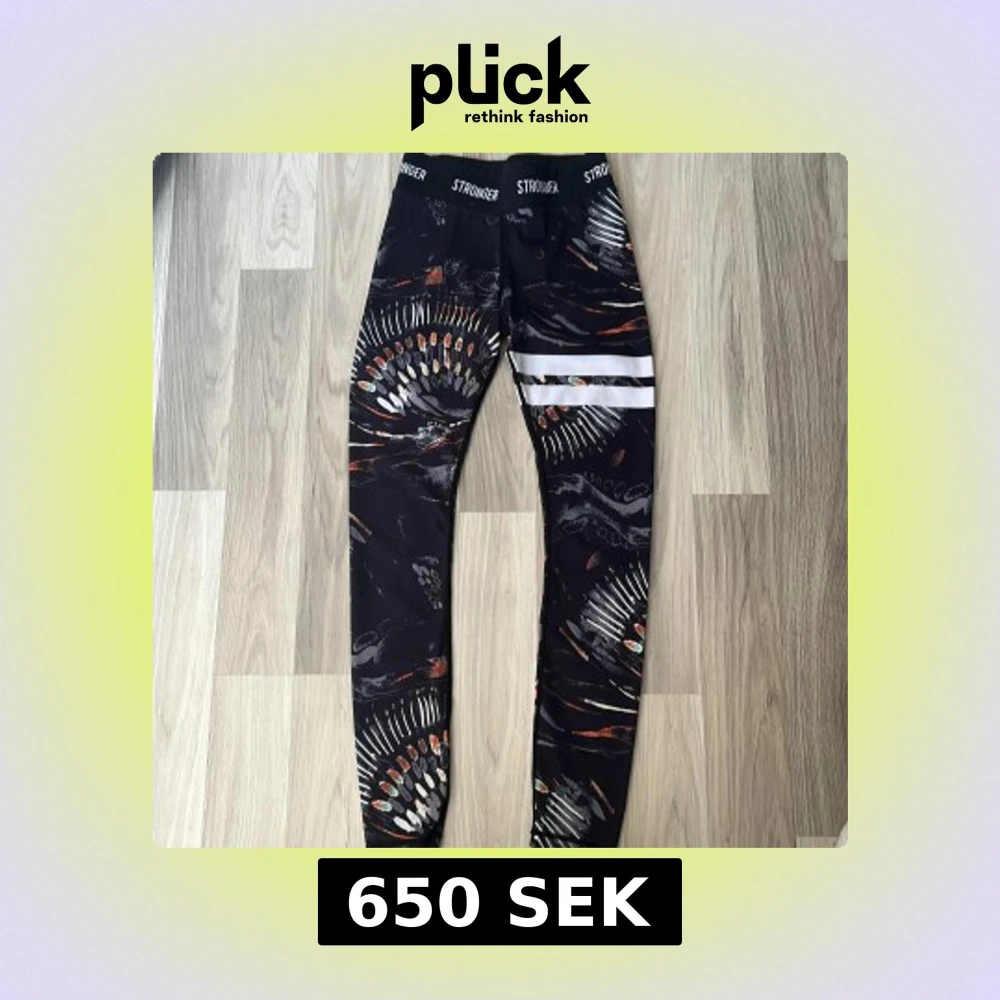 Snygga svarta leggings från Stronger med coolt safari-inspirerat mönster i vitt, orange och grått. Medel hög midja med elastisk logotypkant och två vita ränder på ena benet. Perfekta för träning eller chill, tillverkade i stretchigt syntetmaterial. Pris kan diskuteras. Ny pris 799kr.