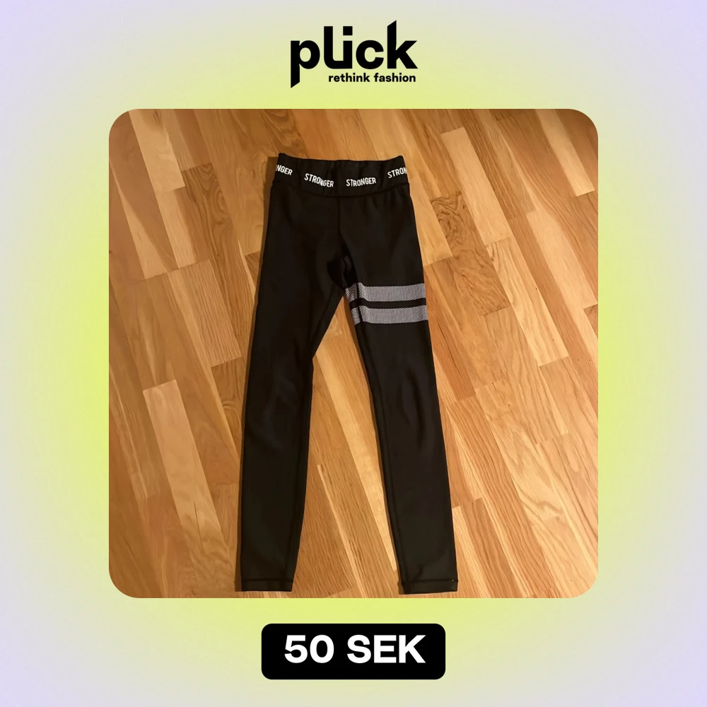 Snygga svarta leggings från Stronger med elastisk midja och vita ränder på ena benet. Perfekta för träning eller en aktiv vardag. De är i storlek XS men skulle säga att de är små i storleken. De är grå svarta och jag säljer pga att de är för korta för mig😊
