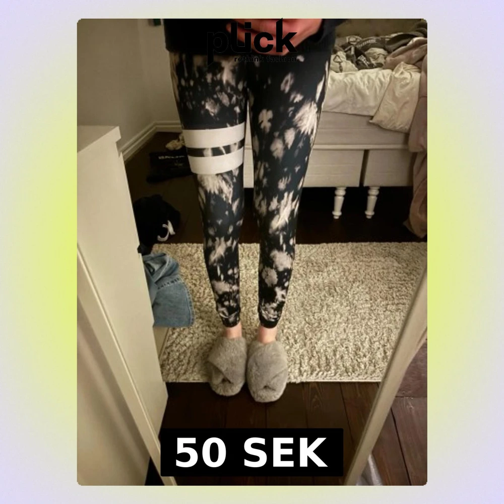 Snygga svarta leggings med mönster i vitt och svart och två vita ränder på ena låret. tight passform, perfekta för träning eller chill. Materialet är stretchigt och bekvämt. STRONGER PASSAR MIG SOM är 170 LÅNG!!!!