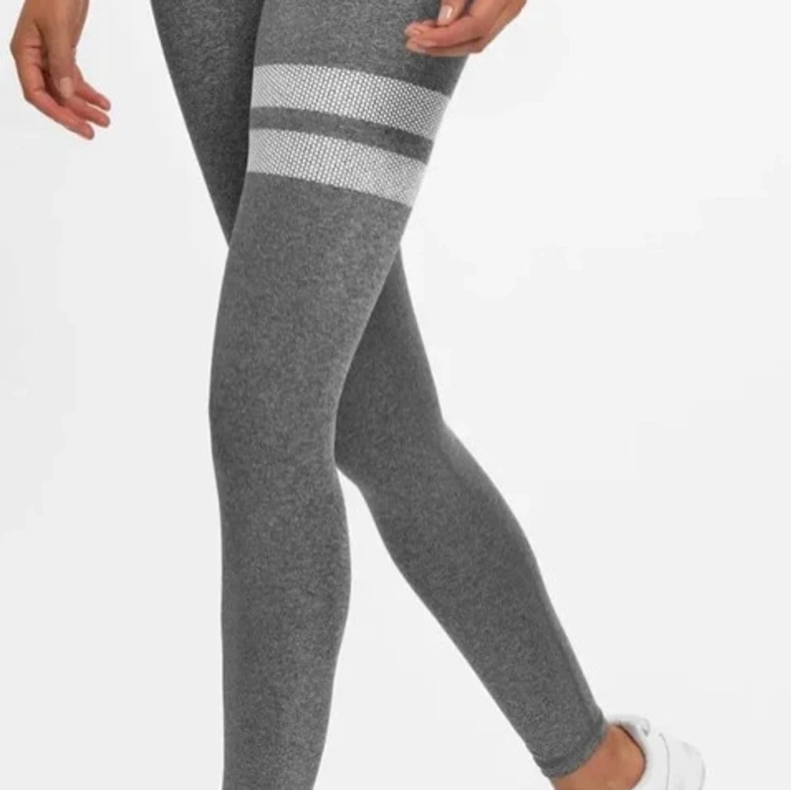 Snygga grå leggings med vita mönstrade ränder runt låren. Perfekta för träning eller en avslappnad dag. Inga tecken på användning. Säljer då de har blivit för små❤️