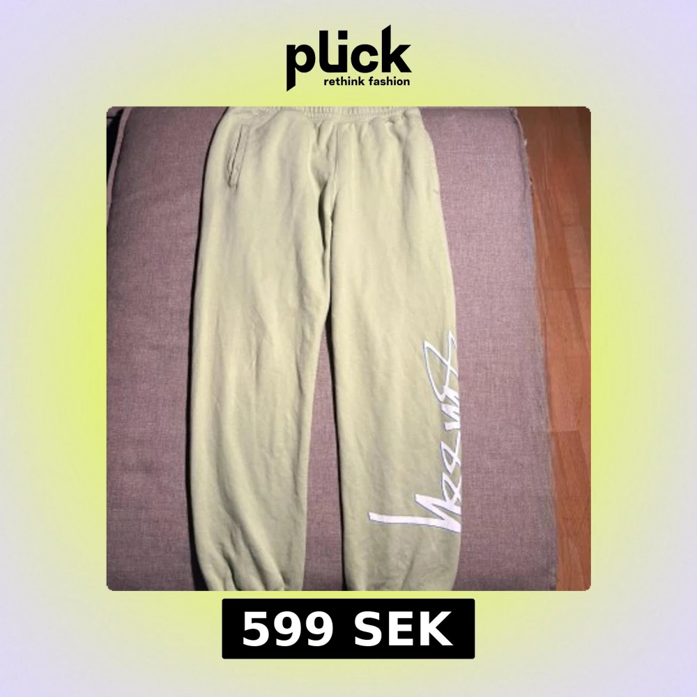 Ljusgröna mjukisbyxor från Stüssy med elastisk midja och muddar vid benslut. Byxorna har fickor på sidorna och en bakficka, samt Stüssy-logga i vitt med blå kontur längs ena benet. Perfekta för chill eller streetwear.