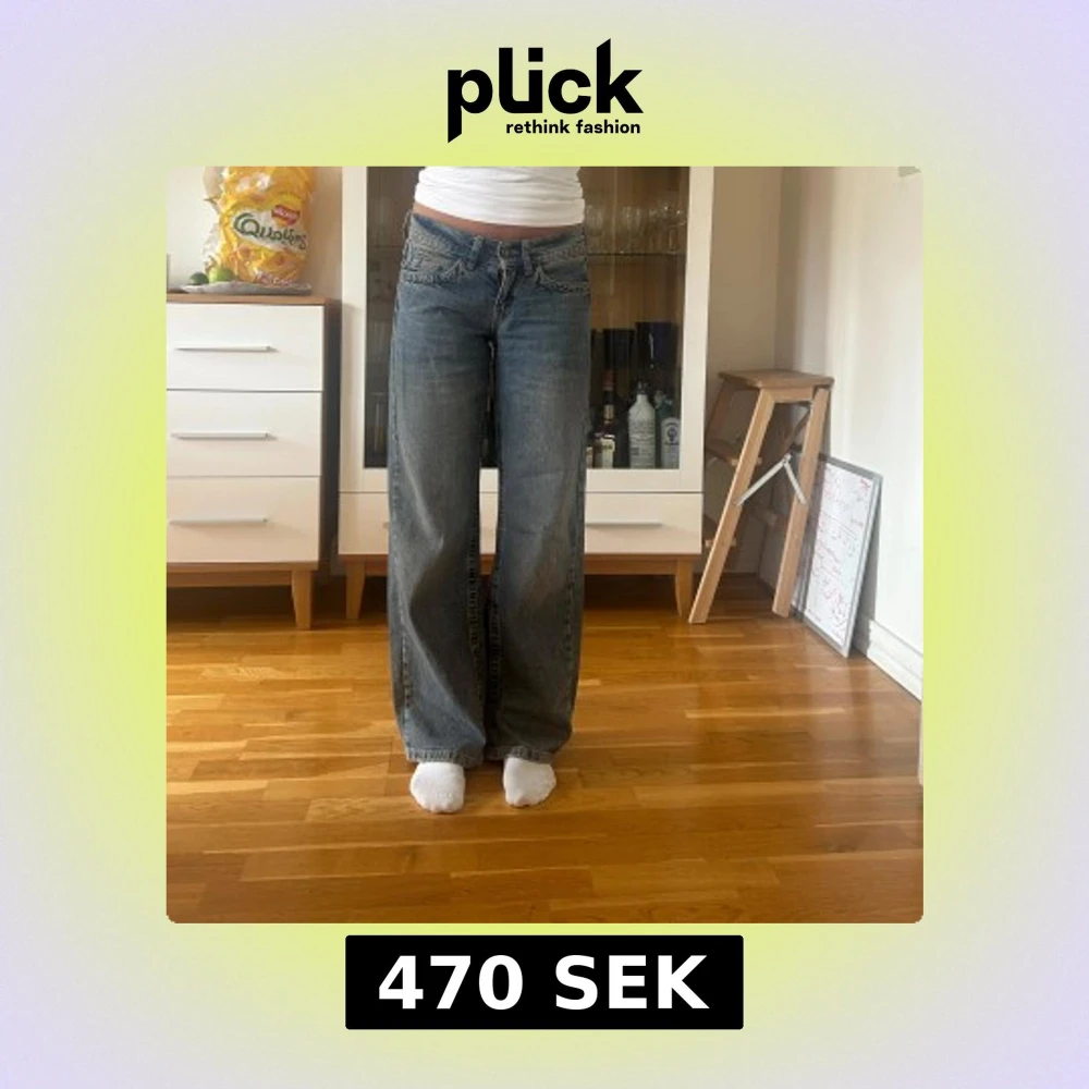 Säljer ett par blåa jeans med låg midja och breda ben. Jeansen är oanvänd och är i storlek 36 vilket passar mig pch jag är 165cm lång.