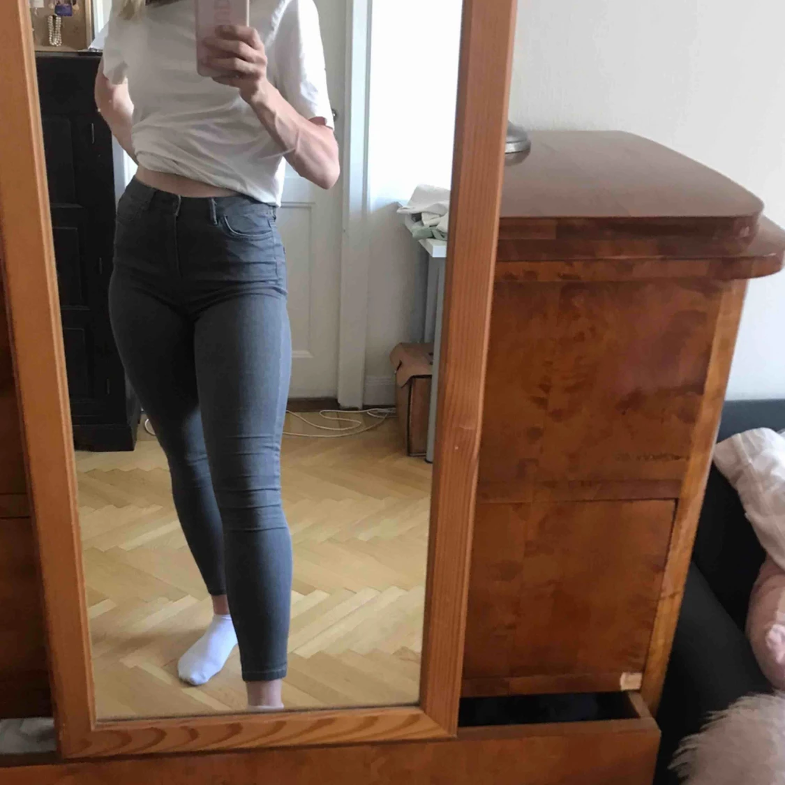 Gråa tighta jeans som är ganska stretchiga. Inte använda så mycket. Köparen står för frakten. Kan även mötas upp i Stockholm