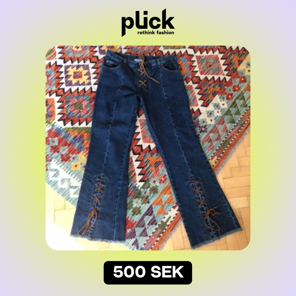 Nice jeans! Bara inte min stil. Storlek saknas men sitter bra på mig som är en 40/42. Midjemått 86 men lite justerbart i och med snörningen som ”knäpper” byxan
