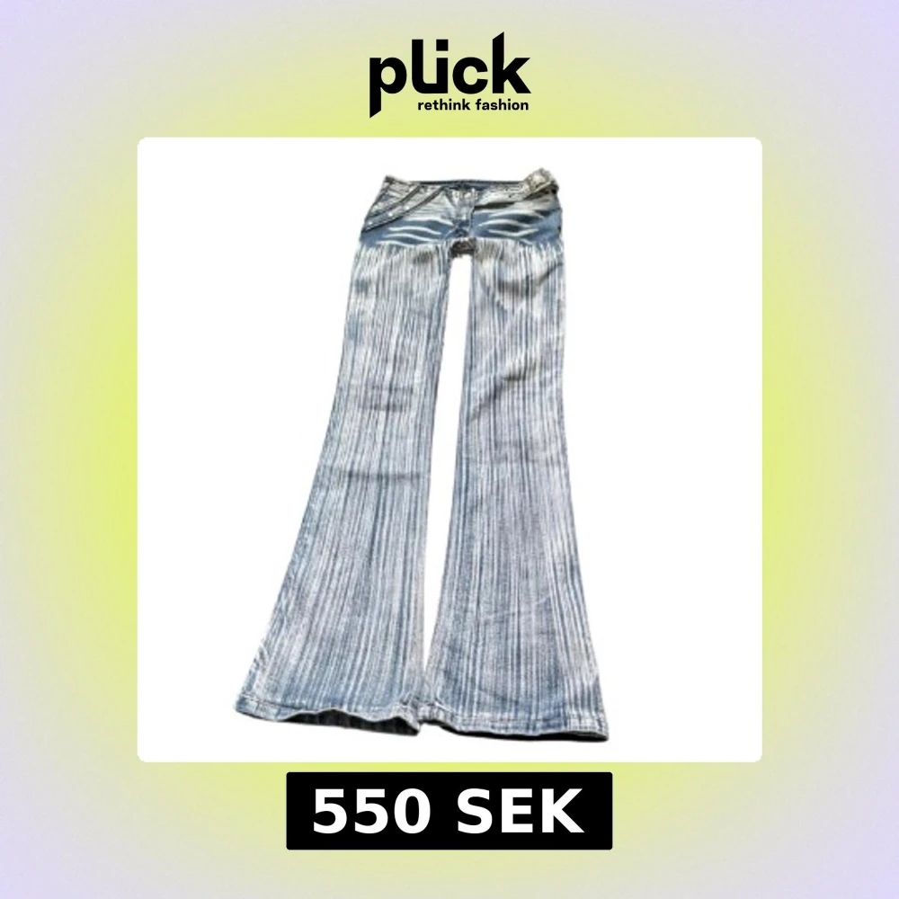 Unika blå och vita bootcut jeans med låg midja och spänne framtill! 💗💓så sjukt snygga!! 💓 Midjemått: 33-37 cm, Innebenslängd: 81 cm !! 💗bilder på mått finns!!! 💗
