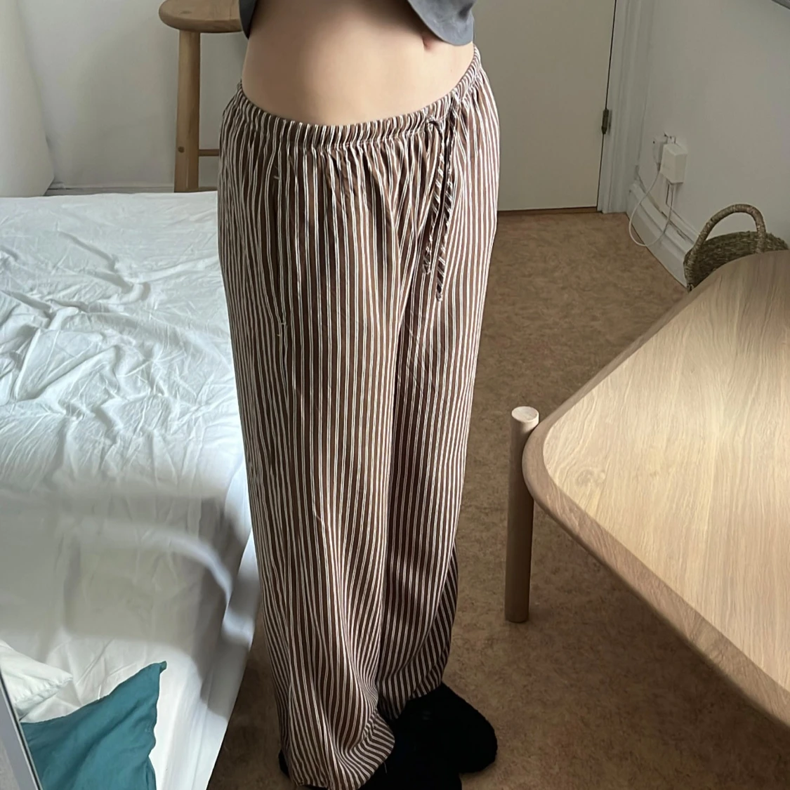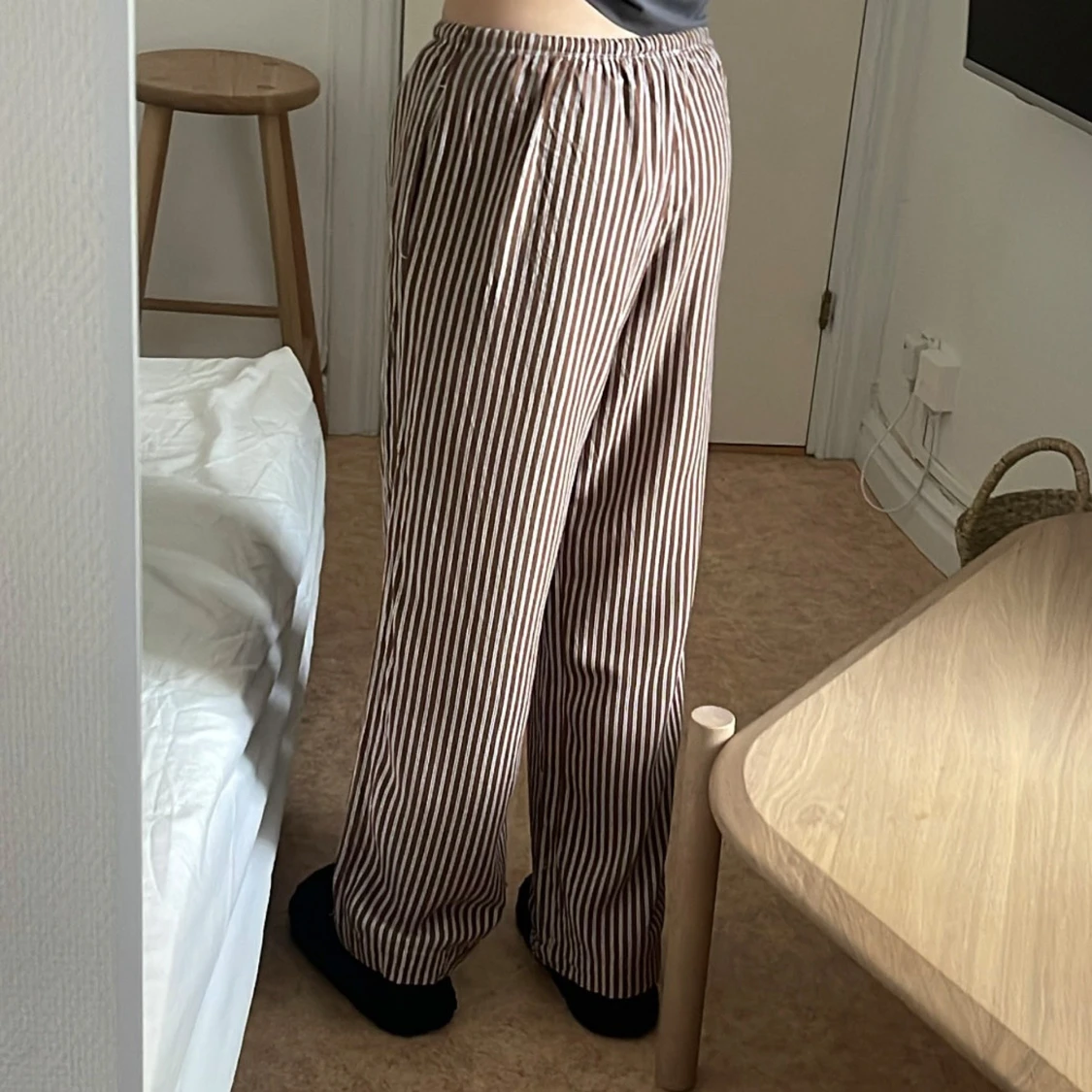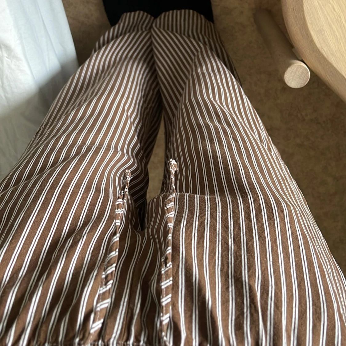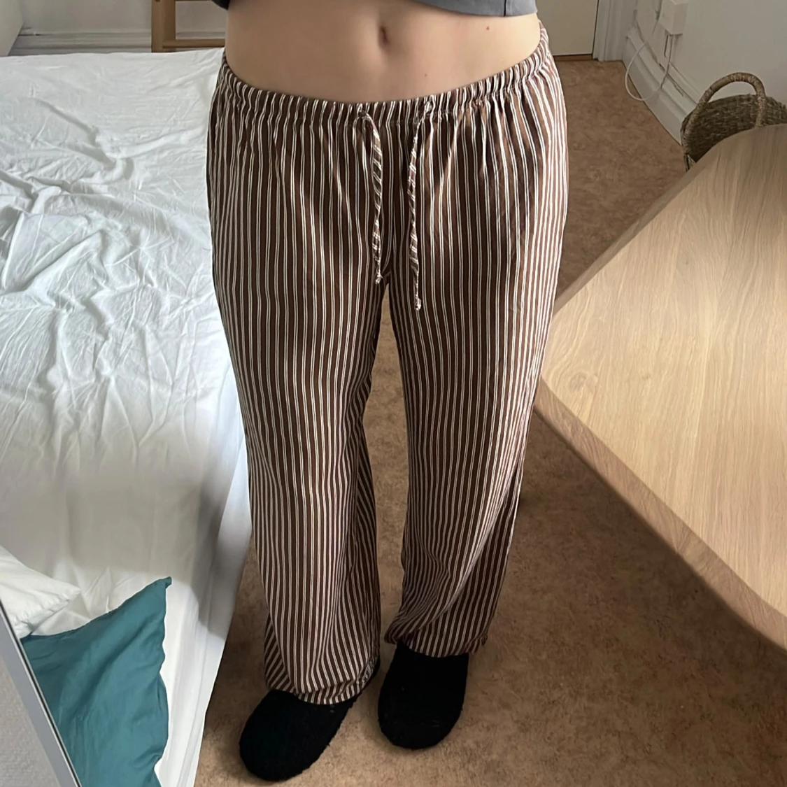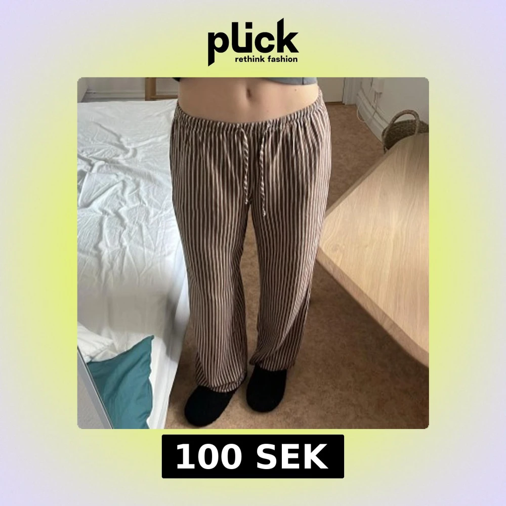 Säljer mina favoritbyxor då de tyvärr krympte i tvätten efter en användning och därmed blev för korta för mig som är 175cm! Står storlek S i, och skulle säga att de nu är runt storlek XXS (svårt att avgöra helt för mig, så du får gå efter bilderna och att jag är 175cm!) Jättebekväma byxor som sitter riktigt snyggt och som passar perfekt att ha hemma som mysbyxor eller pyjamas💘 finns en liten reva på som var där redan när jag fick dem, (se två sista bilderna) men inget som syns väl