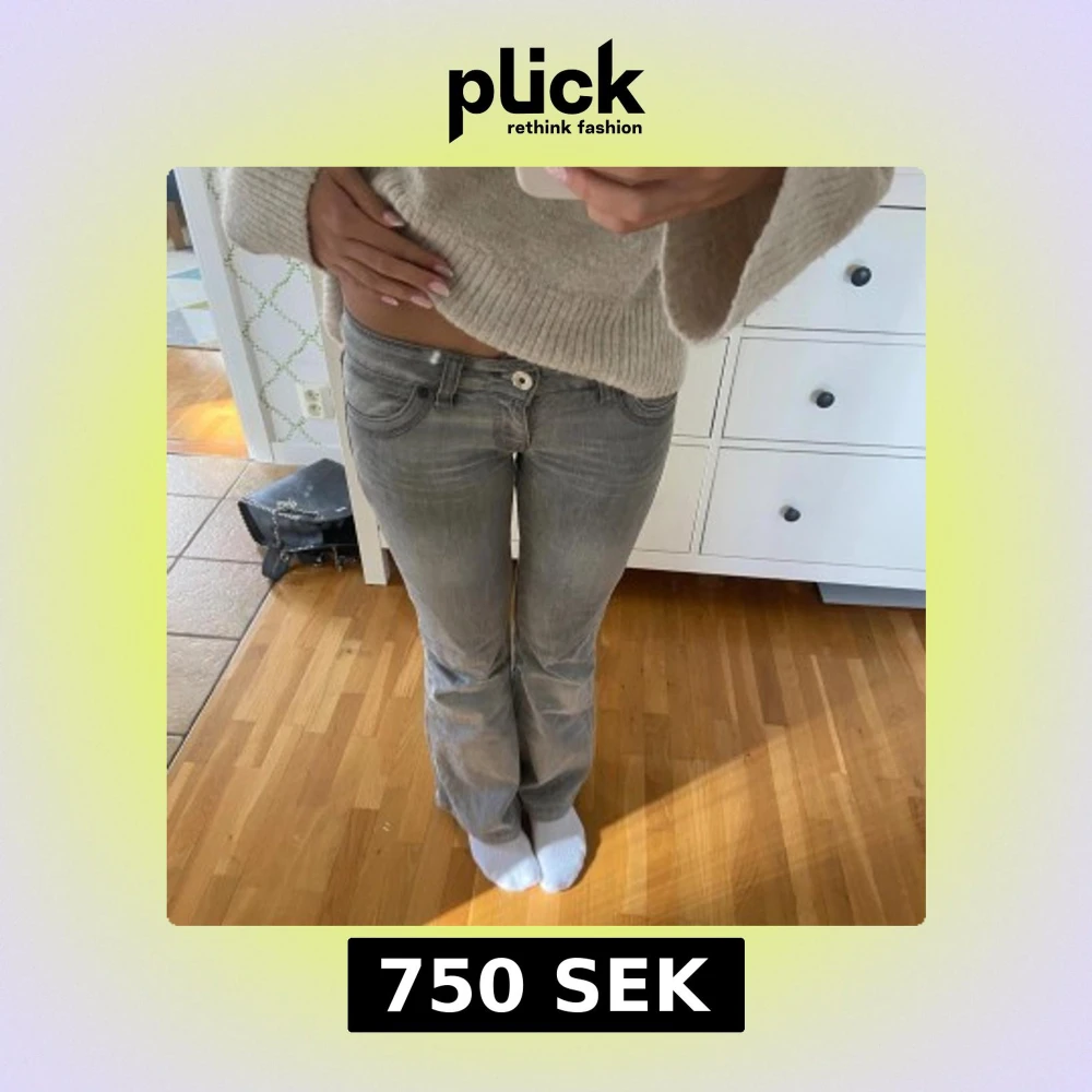 Super low waist snygga grå jeans med bootcut. Jätte fina med en liten design på fickorna. Perfekt passform som sitter tajt upptill och släpper vid benen. Tillverkade i mjukt denim-material. Köpte för 1500kr. Kolla in mina andra kläder säljer ett par mer low waist jeans!