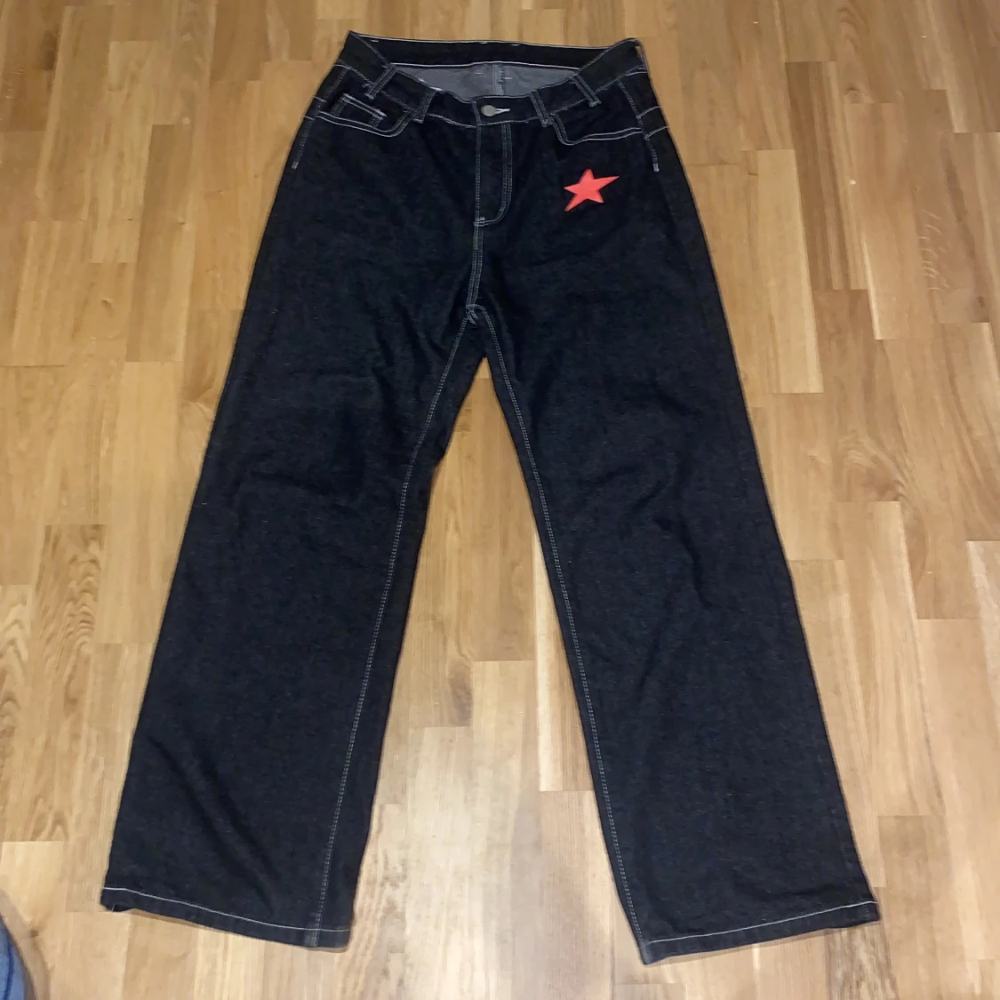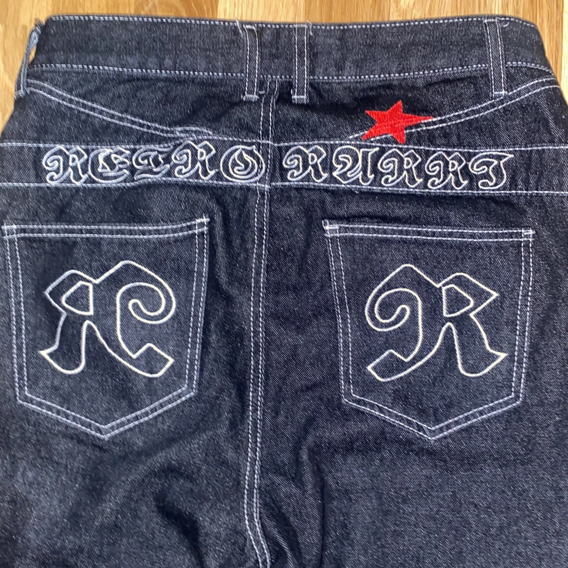 Ett par jätte snygga baggy jeans i storlek M som har två R på bakfickan av jeansen. De är i jätte bra skick, den ända defekten är några slitningar längst ner, men de syns knappt. Skriv för fler bilder!