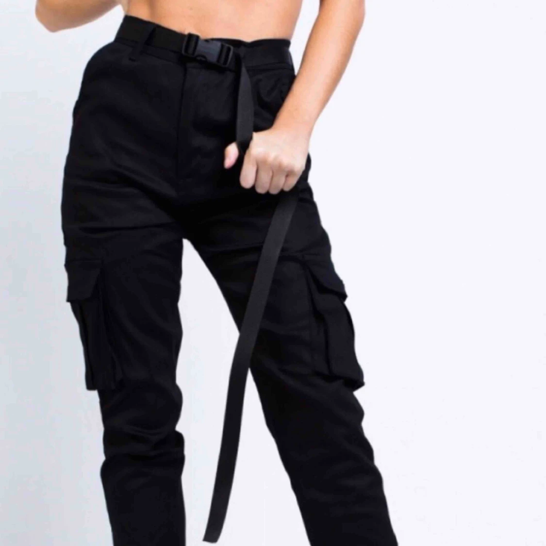Svarta cargo, helt oanvända endast testade prislapp sitter kvar. Strl 42 men passar 38/40 också. Passform inte så stretchiga men väldigt bekväma då dom är 100% bomull. Dom är ingen tight modell så dom ska sitta lite baggy/pösigt.