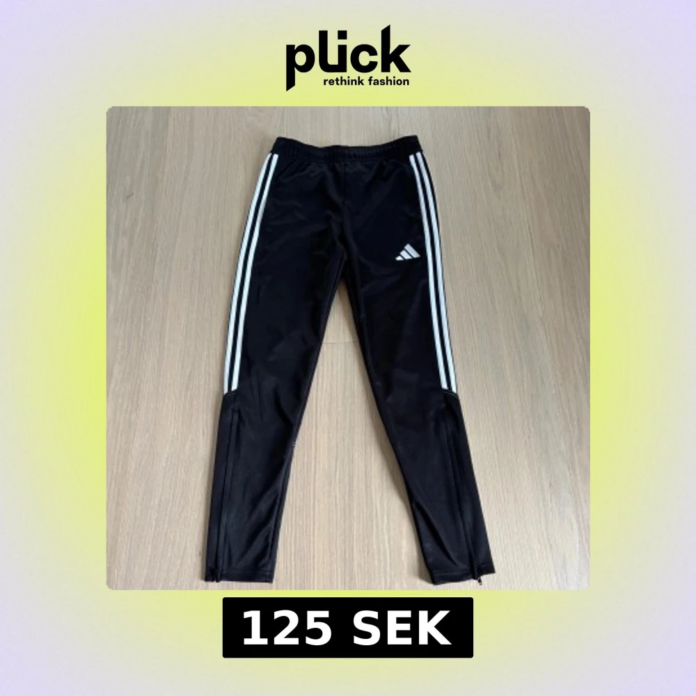 Svarta träningsbyxor från Adidas med klassiska vita ränder längs sidorna och logga på låret. Byxorna har smal passform, dragkedja vid benslut och är gjorda i glansig polyester. Perfekta för sport eller chill.