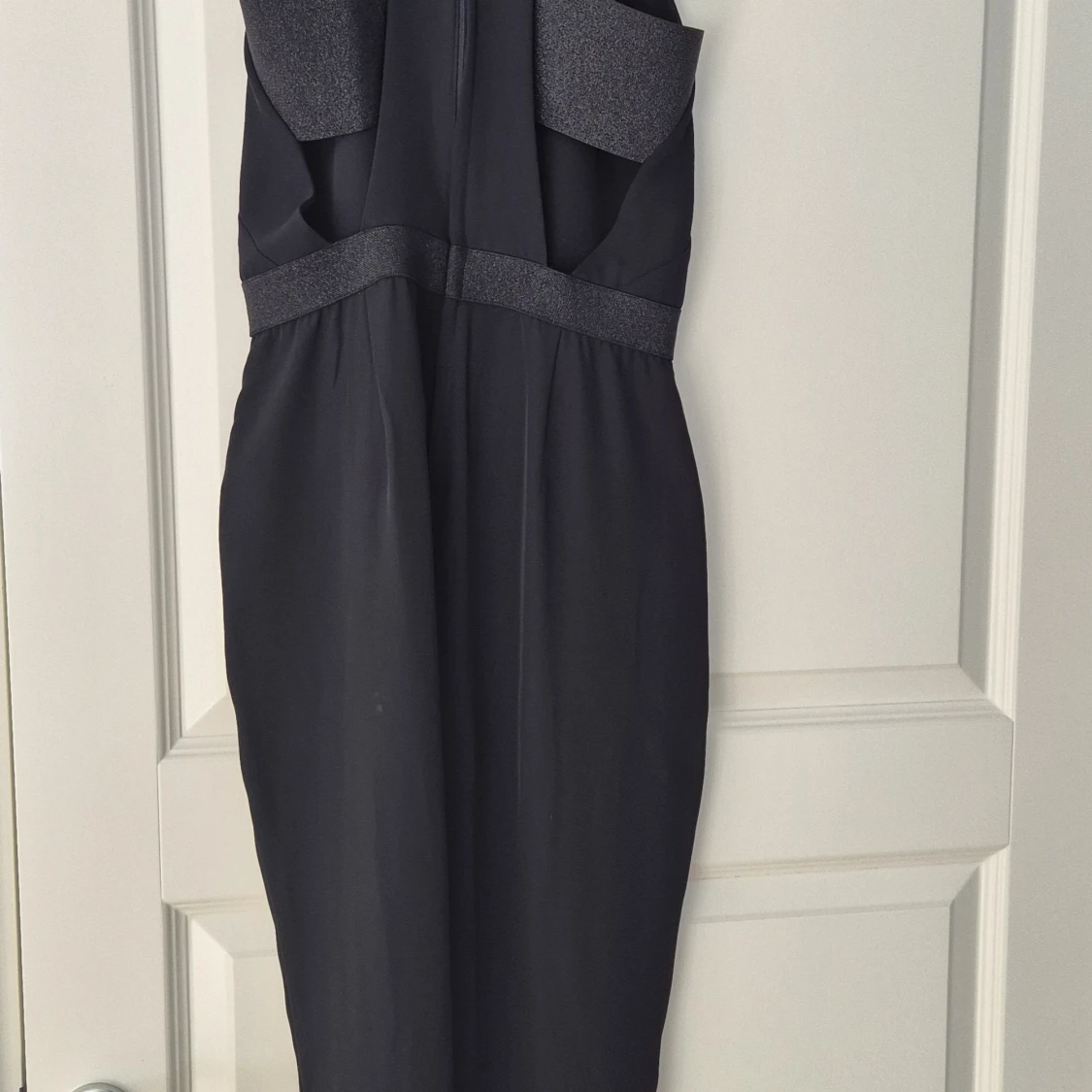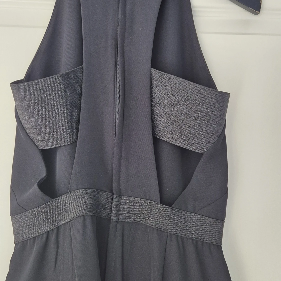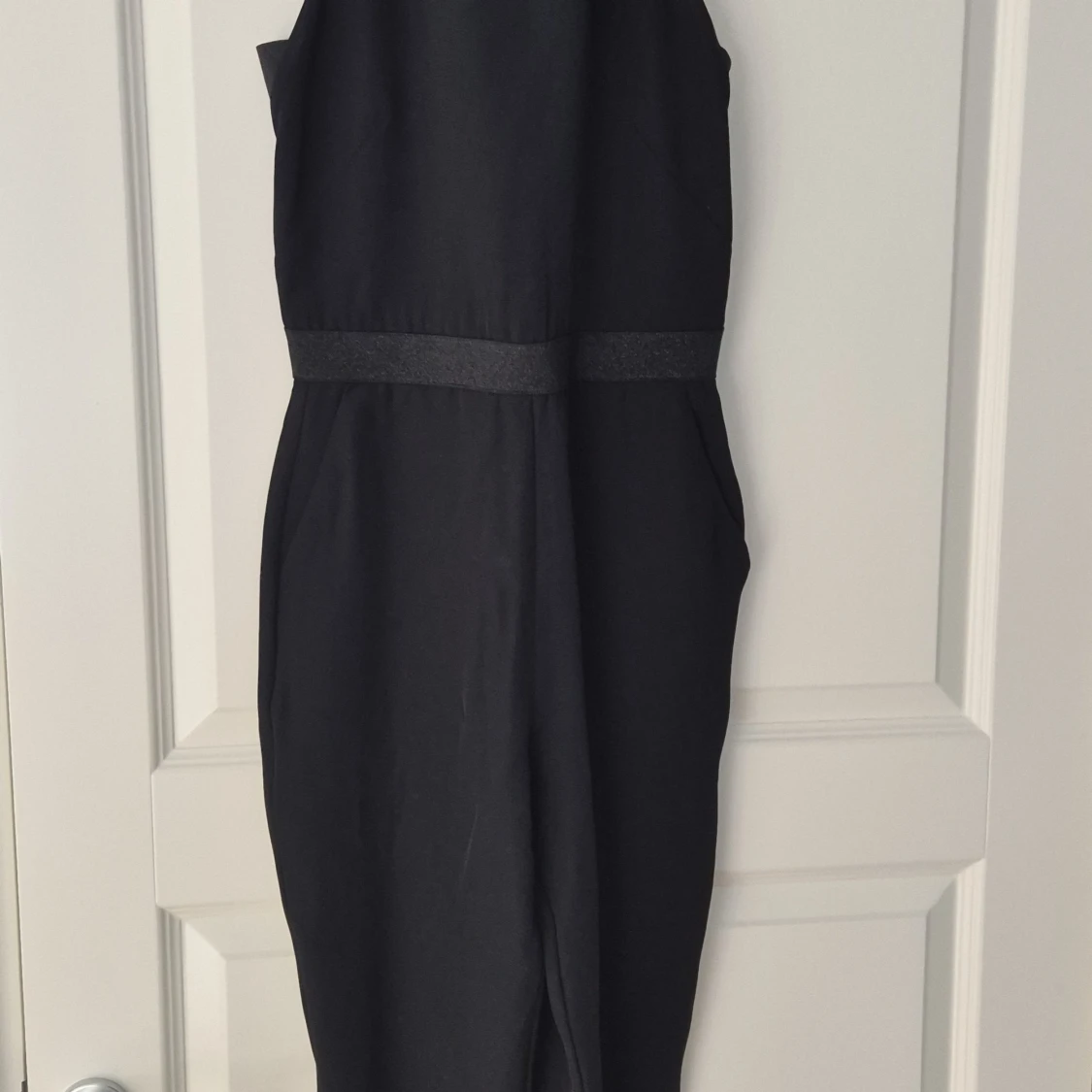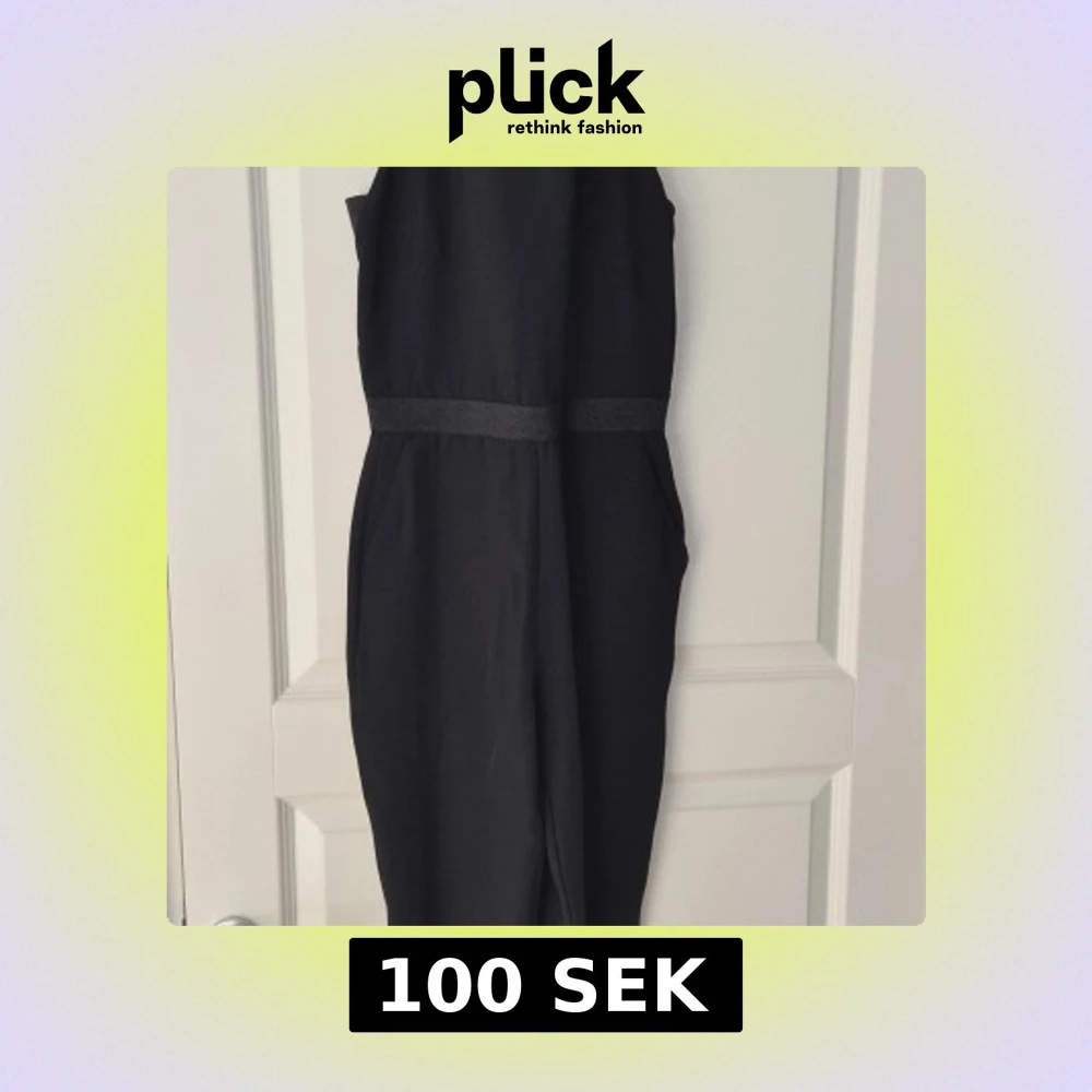 Säljer en svart onepiece med breda axelband och markerad midja. Byxorna har en stilren design och är ärmlös, vilket ger en elegant siluett. Perfekt för dig som gillar minimalistisk stil. Storlek är mer 36 än 38