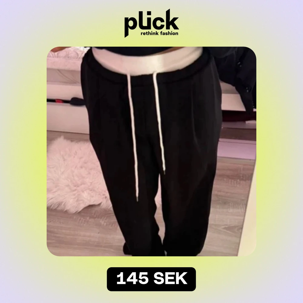 Ett par jätte trendiga svarta byxor med vita detaljer på toppen samt vitt snöre. Materialet på byxorna är ganska tunt! Byxorna har även ett resårband på toppen vilket gör att de sitter tajtare vid midjan och formar kroppen väldigt fint.