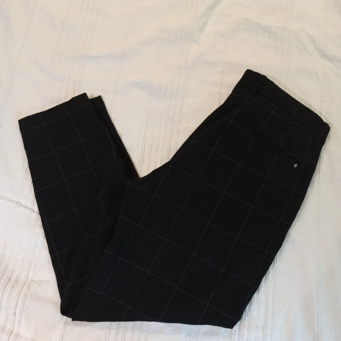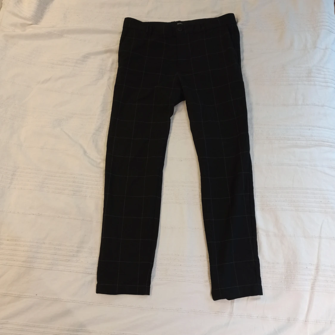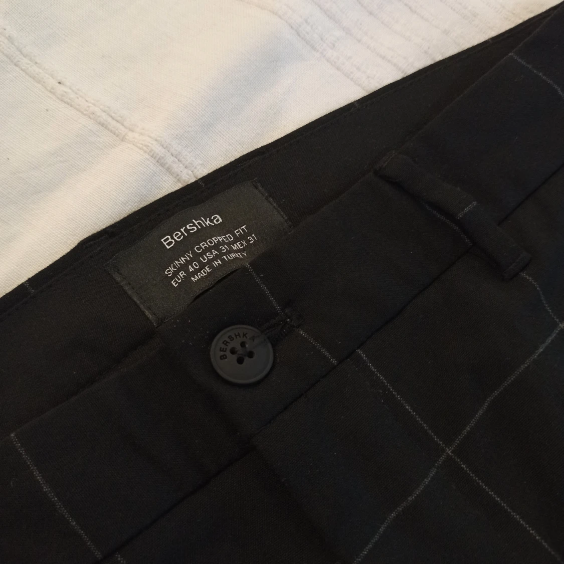 Svart-vitrutiga kostymbyxor från Bershka. Passar som Medium, sitter bra men något korta för mig som normalt har ungefär 31/33. Inköpta för ungefär 30€ för något år sedan men sparsamt använda, därav är de i väldigt bra skick. Se bild för storlek