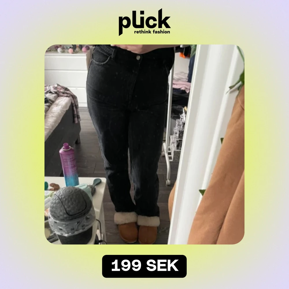 Svarta high waist jeans från bershka i stl 38, en ”bälthållare” är trasig (se bild 3) men annars är de så nya de kan bli 😊Jag är 172 och de sitter perfekt i längden 🙌🏻